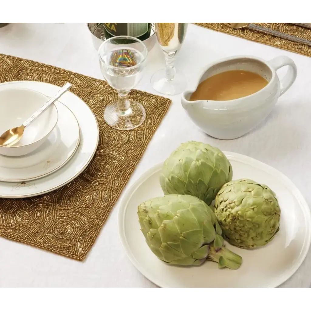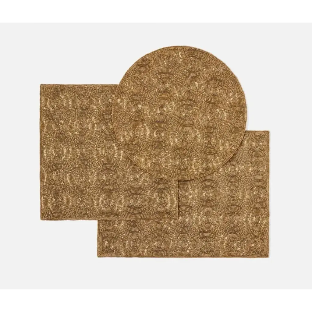 Finish: Shiny Gold Material: Glass Beads With an abundance of golden glass beads hand-sewn into an undulating, sun-inspired pattern, our Valentina placemats give the table a golden glow. Blue Pheasant's products are handmade with care by artisans using natural materials. They are not mass produced, so variation between products should be expected, and this is why we love them! It is these irregularities that makes Blue Pheasant what it is—a special brand whose collections are distinctly handmade, full of charm and originality you’ll never find in machine-made products.