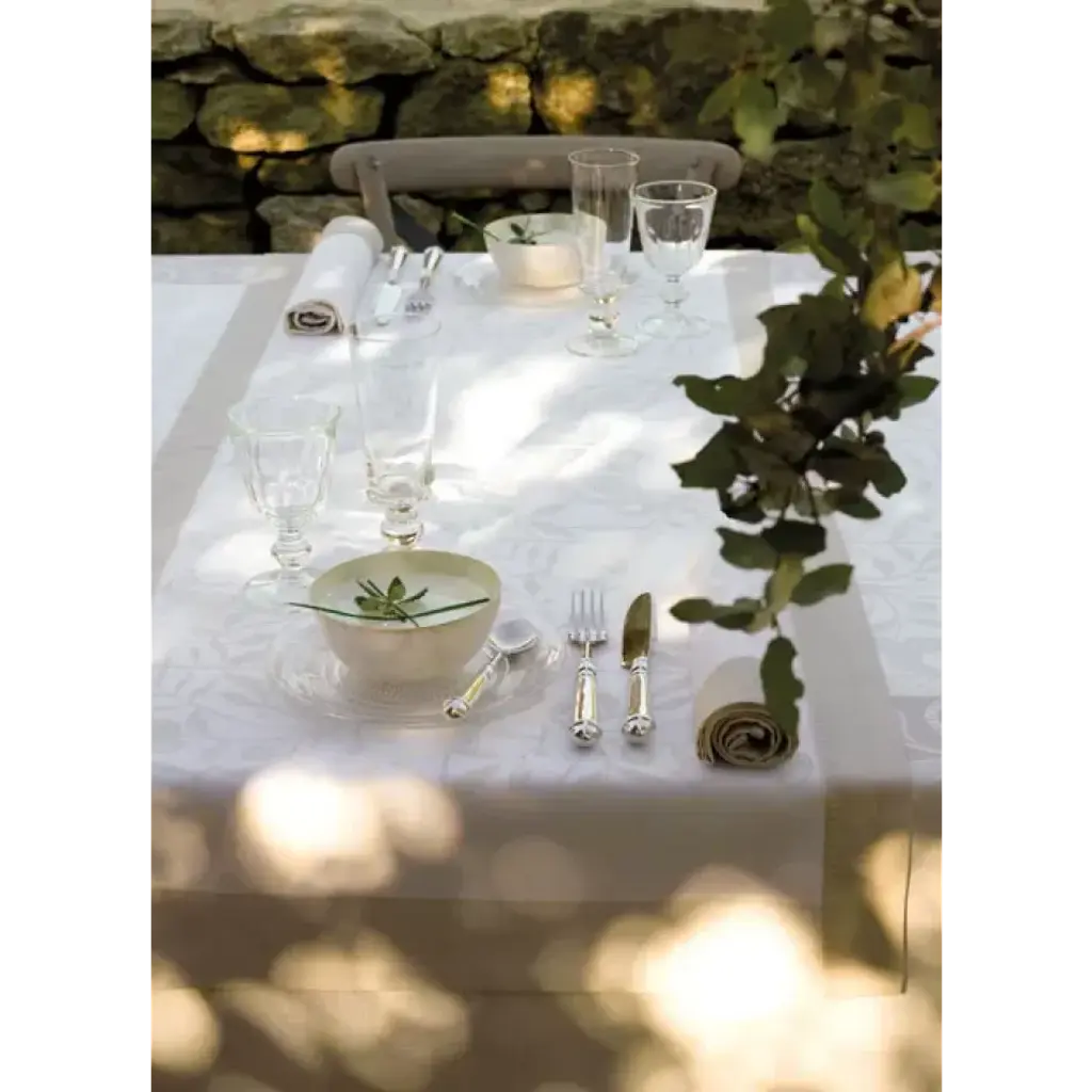 Timeless chic. Venezia table linens are inspired by 17th Century lace shrouds and cuffs. In the chain-link jacquard weave the effect is that of a gauze which is so finely woven that it at times appears transparent. Since 1888, Le Jacquard Francais has created a collection of table linens without equal. Weavers, warp beamers, knotters and other specialists work in harmony to perfect the weaves and colors of all of their linens. Classic Le Jacquard Francais linens are characterized by using framed woven patterns to create timeless tablecloths, napkins, placemats and table runners that will beautify your tables for many years. Le Jacquard Francais coated tablecloths are made of 100% cotton weave with long fibers. They are waterproof and stain-resistant thanks to a patented and exclusive acrylic coating that withstands washing. Newly introduced, LJF by Le Jacquard Francais is a more casual line of contemporary looks that mixes colors and patterns and plays with graphics. Practical and easy to use, these tablecloths will stand up to frequent use in the kitchen or patio.