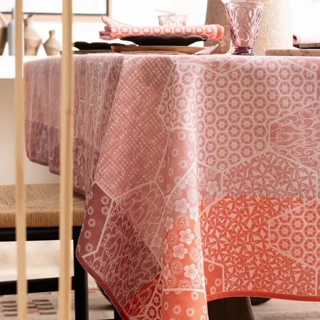 An invitation to travel through the aesthetics of kimonos and traditional Japanese motifs. These coated tablecloths will bring delicacy and femininity to your home. Since 1888, Le Jacquard Francais has created a collection of table linens without equal. Weavers, warp beamers, knotters and other specialists work in harmony to perfect the weaves and colors of all of their linens. Classic Le Jacquard Francais linens are characterized by using framed woven patterns to create timeless tablecloths, napkins, placemats and table runners that will beautify your tables for many years. Le Jacquard Francais coated tablecloths are made of 100% cotton weave with long fibers. They are waterproof and stain-resistant thanks to a patented and exclusive acrylic coating that withstands washing. Newly introduced, LJF by Le Jacquard Francais is a more casual line of contemporary looks that mixes colors and patterns and plays with graphics. Practical and easy to use, these tablecloths will stand up to frequent use in the kitchen or patio.