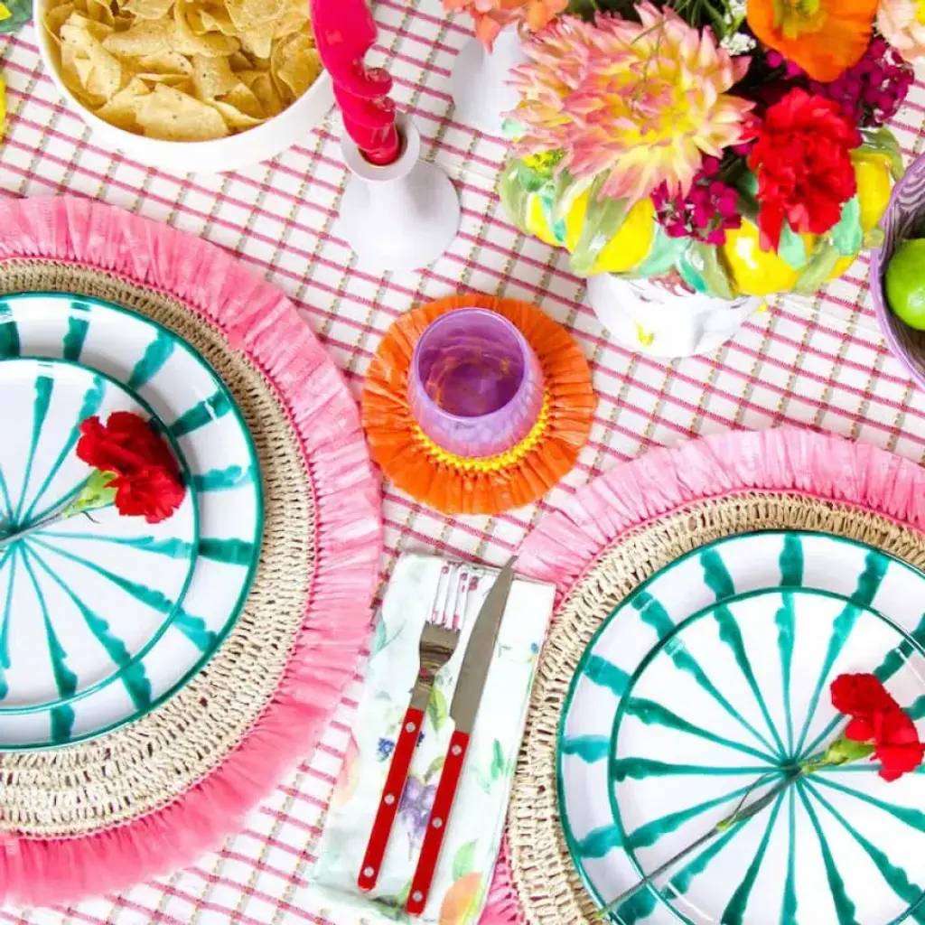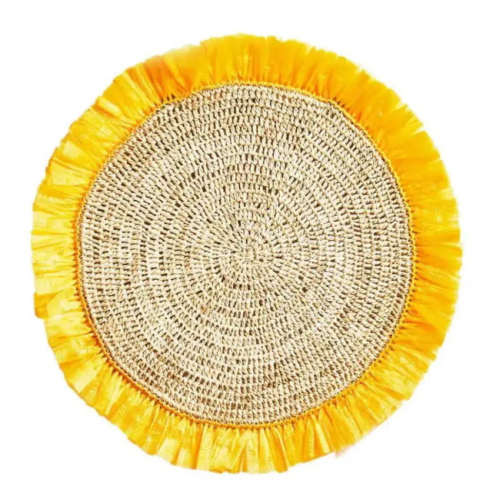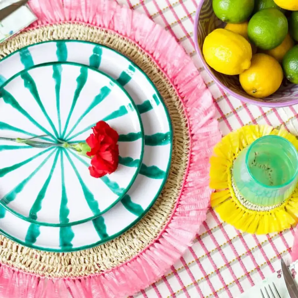 Eye-catching colors, natural rattan, and the fun of fringe all combine to create these cheery placemats hand-woven from recycled twine and rattan. Pair with coordinating Woven Rattan Coasters.