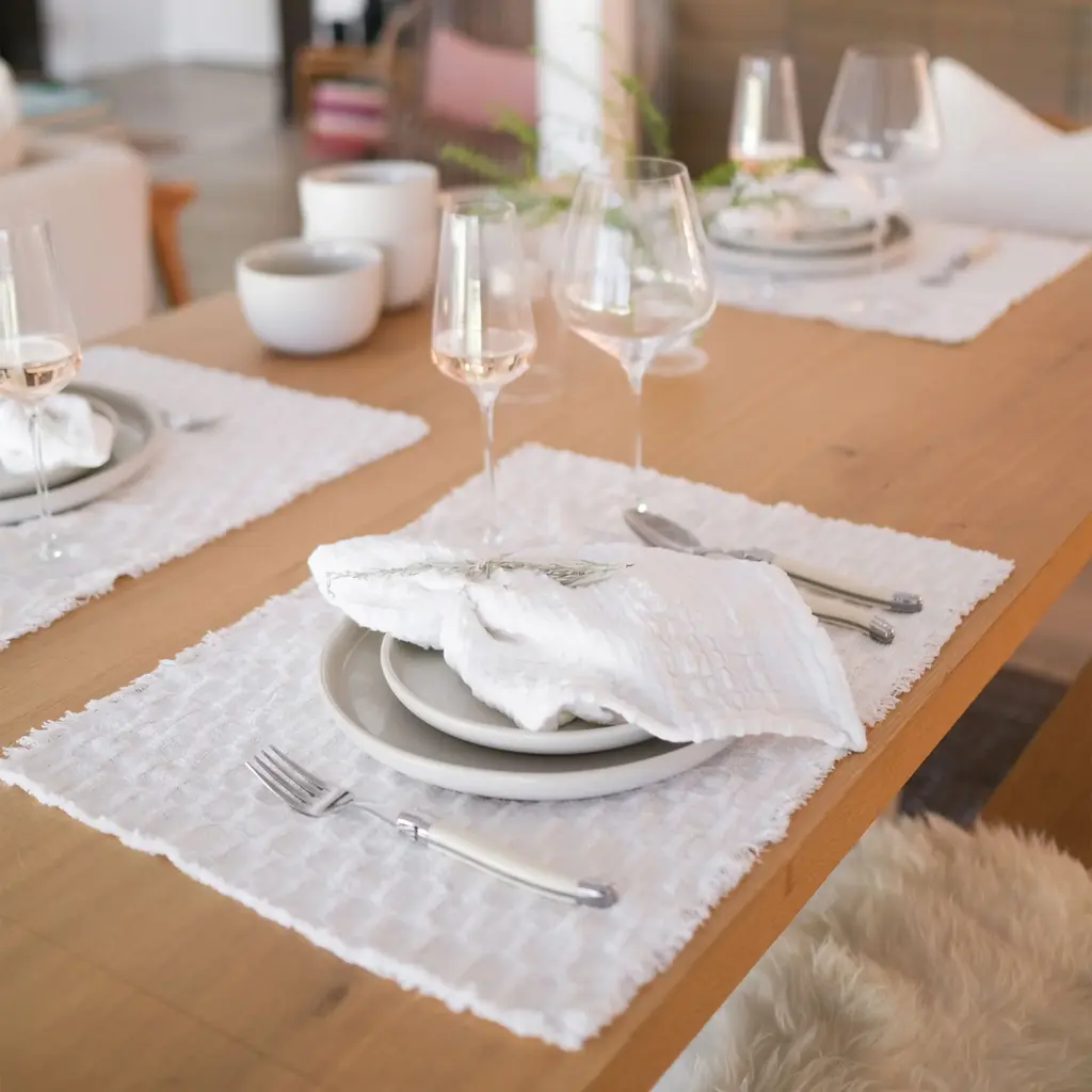 Elevate every meal with the Wren Placemat (Set of 4) from Pom Pom At Home. Its charming wavy pattern and delicate frayed edges add a subtle touch of style, transforming your table into a welcoming space perfect for memorable dinner parties. Durable and stylish, these placemats help protect your surfaces while enhancing your dining experience. Highlights