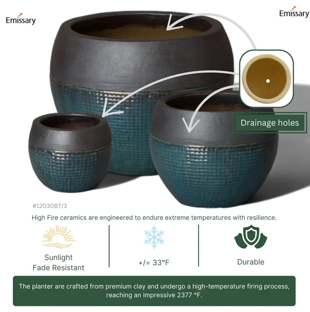 This round net ceramic pot is handcrafted and finished in a matte black/teal glaze. Starting at 12 inches wide at the mouth of the piece. Made from heavy and durable red clay, this planter is able to be used both indoors and outdoors. The base of the planter has a one inch diameter drainage hole to help prevent over watering. This simple and sleek planter is the perfect addition to any modern or contemporary living space.