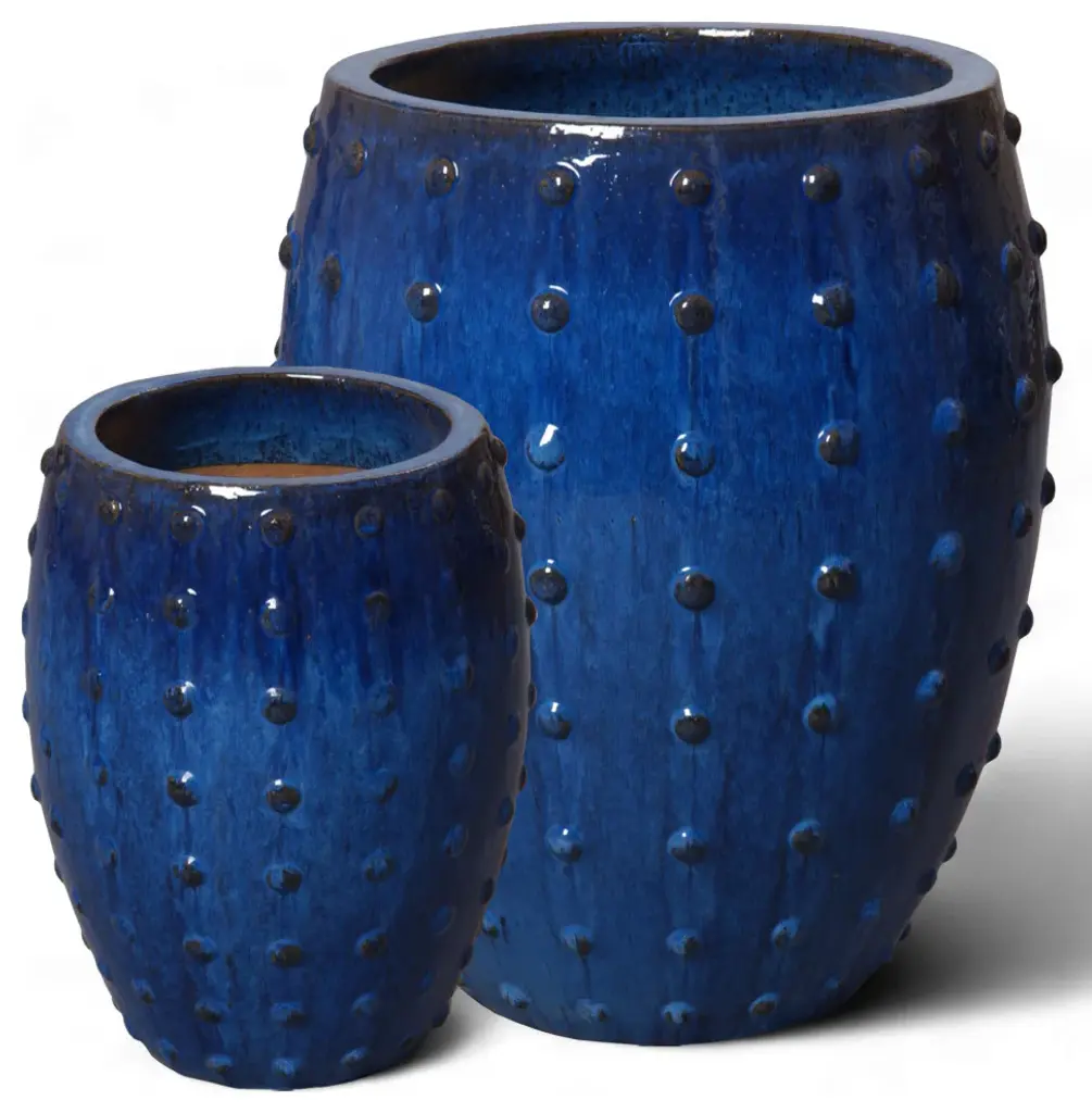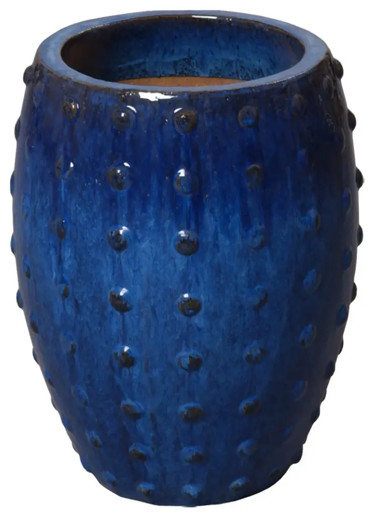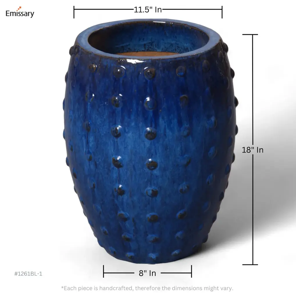 This Round Studded Planter is crafted of ceramic with a Blue glaze. Suitable for outdoor and indoor use. Adds color and texture to your home or garden.