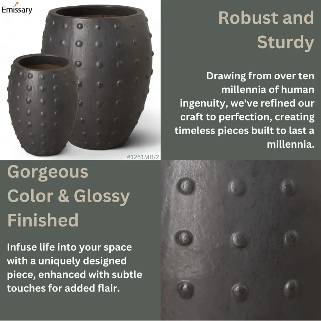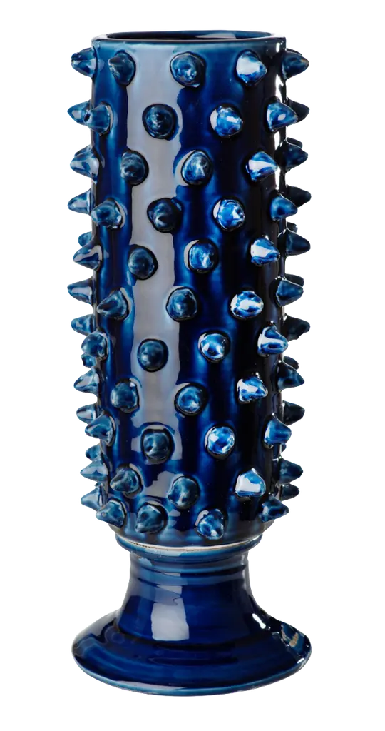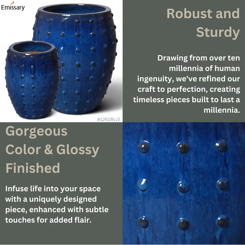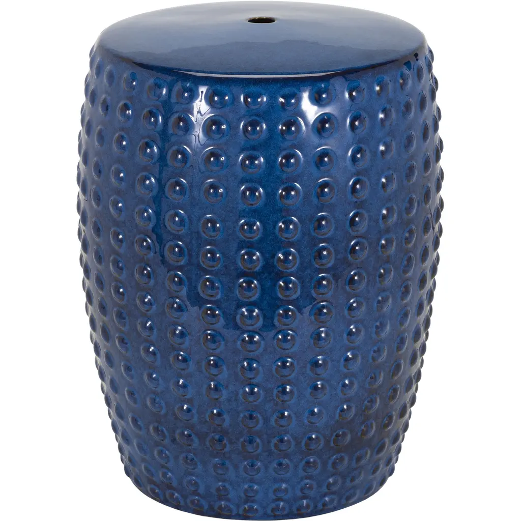 This Round Studded Planter is crafted of ceramic with a Blue glaze. Suitable for outdoor and indoor use. Adds color and texture to your home or garden.