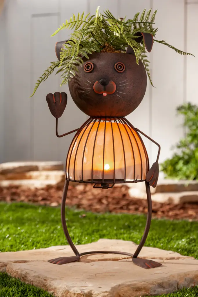 Add personality to your garden, porch or patio with this solar powered metal rabbit pot head. Standing 20.87-inches tall, it will tower over low blossoms and accent taller ones with a bright orange hue, illluminated by an LED light that will come on as the sun goes down. Change the personality of your rabbit pot head by planting different flowers or plants in the planter head. You can achieve a colorful look with the illuminated wire frame body and rustic brown finish. This cat pot head will make a truly unique addition to your porch, patio or garden and will delight your guests and neighbors.