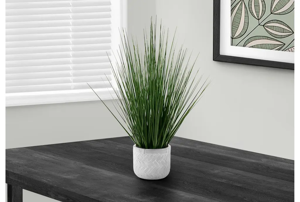 Add a touch of greenery to your home with this 21" Green Plastic Artificial Grass in White Pot. Perfect for indoor settings, this artificial grass brings a natural feel to any interior space without the need for maintenance. The authentically textured plastic material gives it a realistic appearance, making it a great addition to your decor.