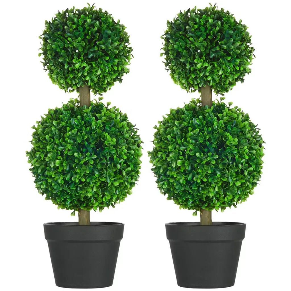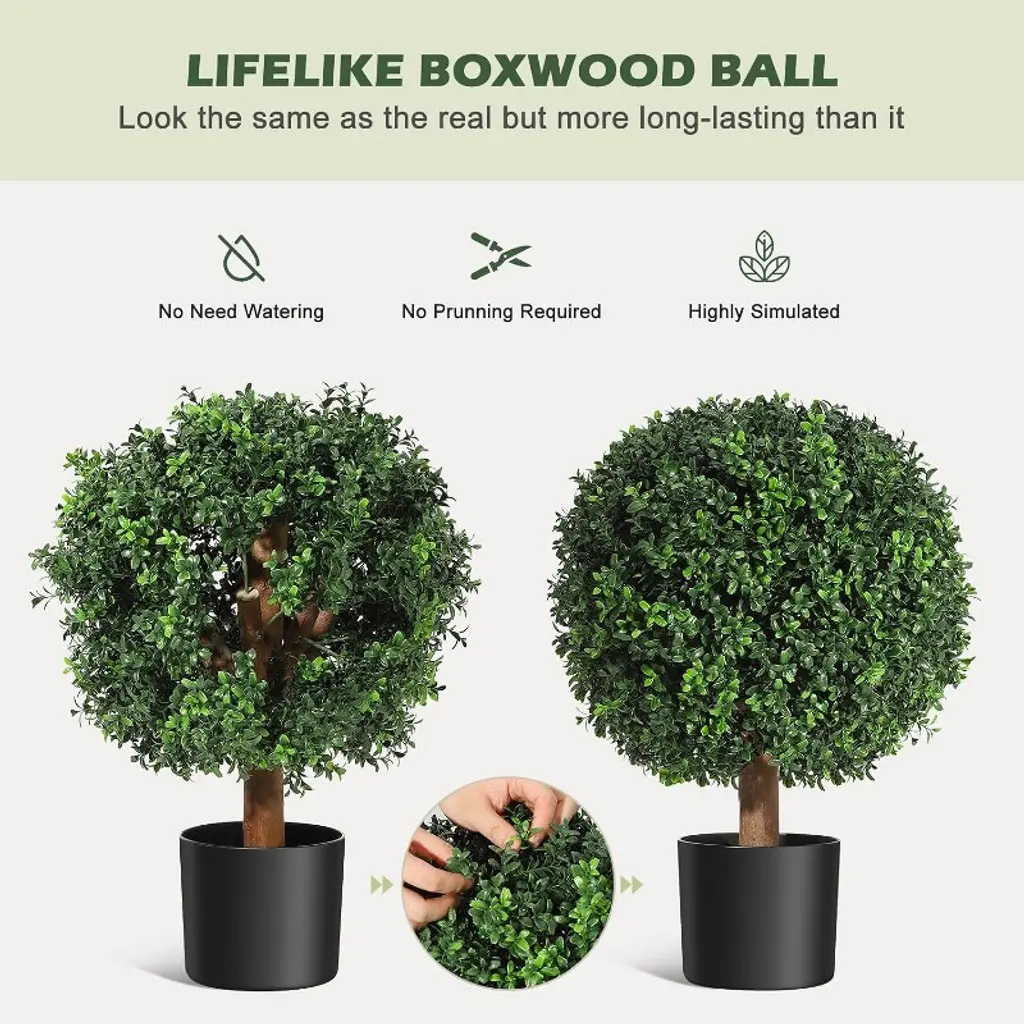 24" Artificial Topiary Boxwood Ball Trees, Set Of 2 Uv Resistant Plants, Faux Boxwood With Pots For Front Porch, Indoor Walkway, Entryway Decorating