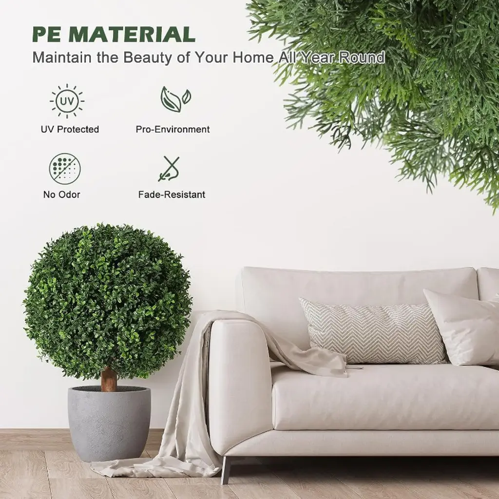 Realistic Design: Standing 24INCH tall, this topiary tree features lush, vibrant foliage with a natural texture, closely resembling a real boxwood. Dimensions & Size: Product Dimensions: 17 IN. W x 17 IN. D x 24 IN. H ; Nursery Pot Dimensions: W: 6.69 INCH, H: 5.75 INCH ; Measurements are calculated from each furthest outstretched dimension, all products are handmade, slight differences are normal New PE Materials: The boxwood topiary used highly quality new PE material that with UV protection, anti-fading, and no pungent odour, ensuring it stays beautiful for years. Pre-Potted And Easy To Display: The topiary trees artificial outdoor is securely placed in a cement-filled pot, these trees are ready to use right out of the box. You can easily place them in decorative planters to match your home’s style, bendable stems allow for easy reshaping to reach the desired fullness and shape Easy Care: Forget about watering or pruning—simply dust the artificial plants occasionally to maintain its fresh, natural appearance. Versatile Accent: Topiary ball perfect for enhancing both indoor and outdoor spaces like front porch, patios, or living rooms, and makes a great housewarming gift.