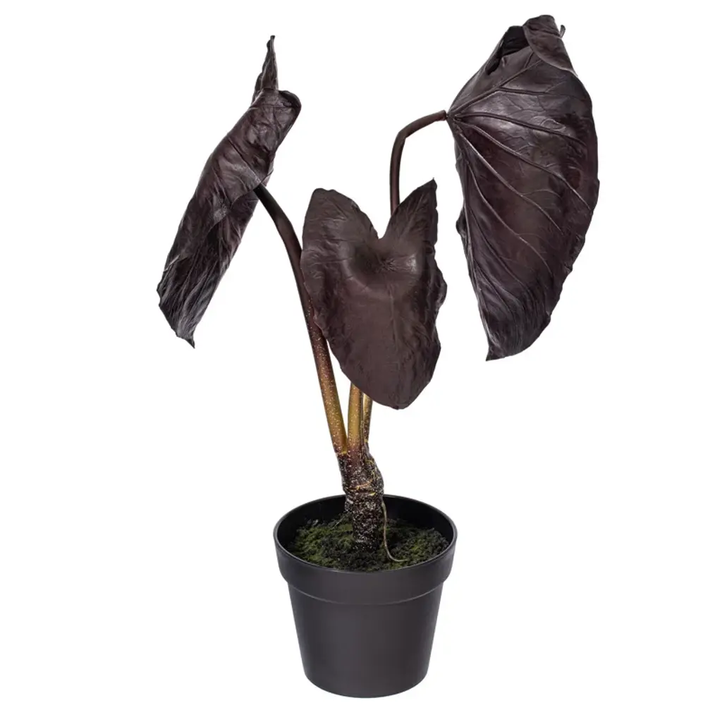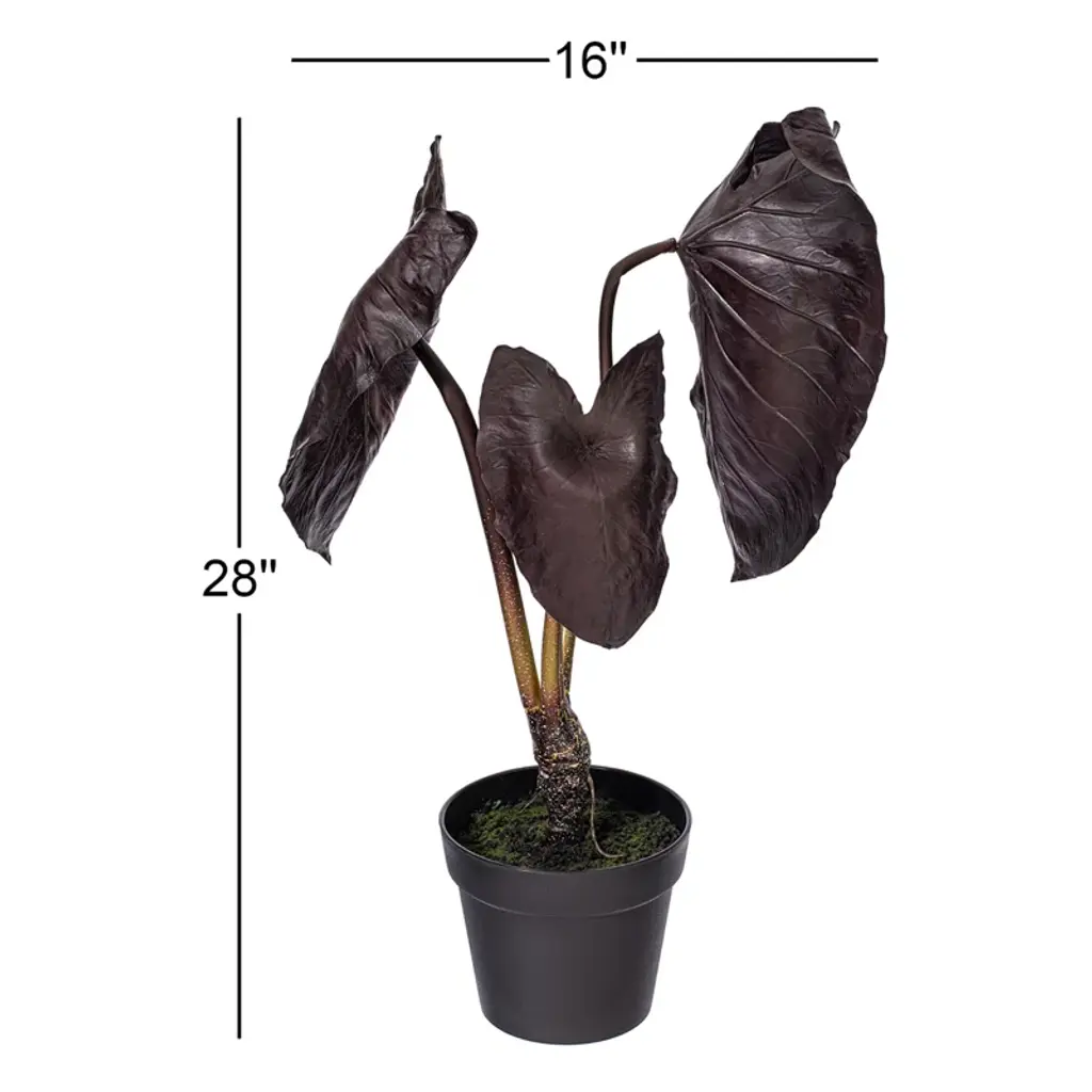 Primrue 28" x 17" alocasia black magic potted. This is an artificial plant that requires no maintenance. It comes in a black plastic pot that can be nested into a decorative container. The container measures 6.75" H, bottom diameter 5.5" W, top diameter 8" W.