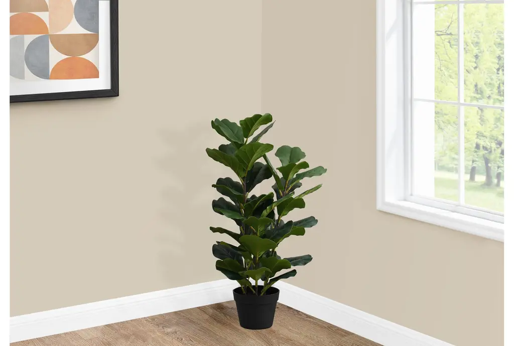 Add a vibrant burst of greenery to any floor of your home or office with this 32" tall artificial indoor fiddle tree in a 6" black pot. The 45 real touch, lush green leaves create a lifelike appearance, making it a perfect decorative accent. This easy-care faux potted plant is made from the highest quality materials and requires no maintenance or watering, ensuring a sustainable, environmentally friendly addition that will last a lifetime.