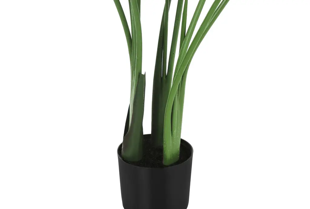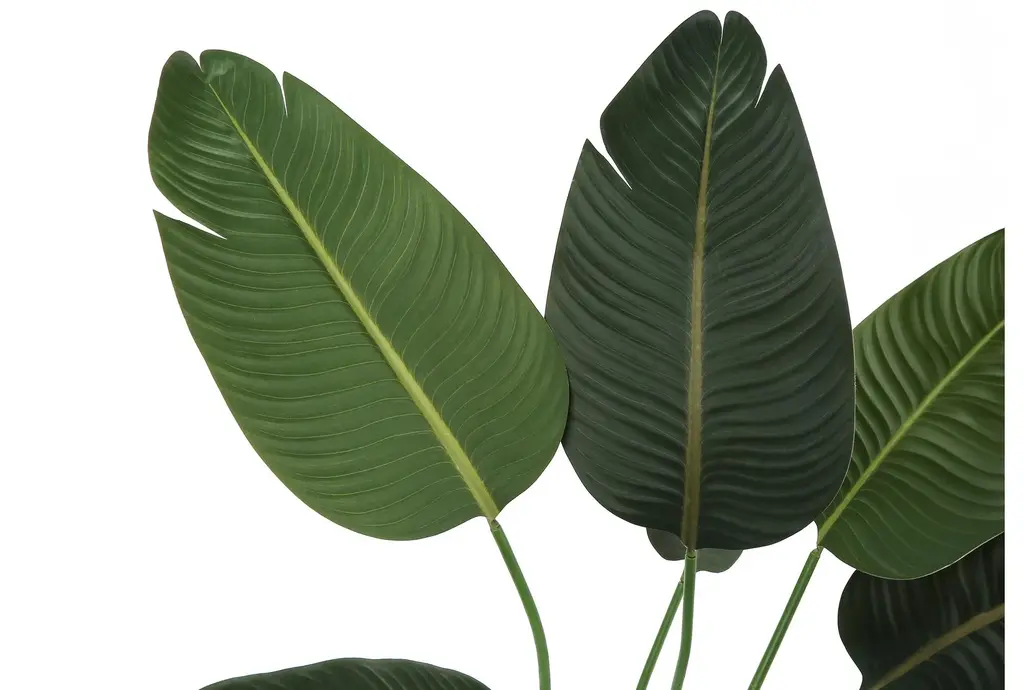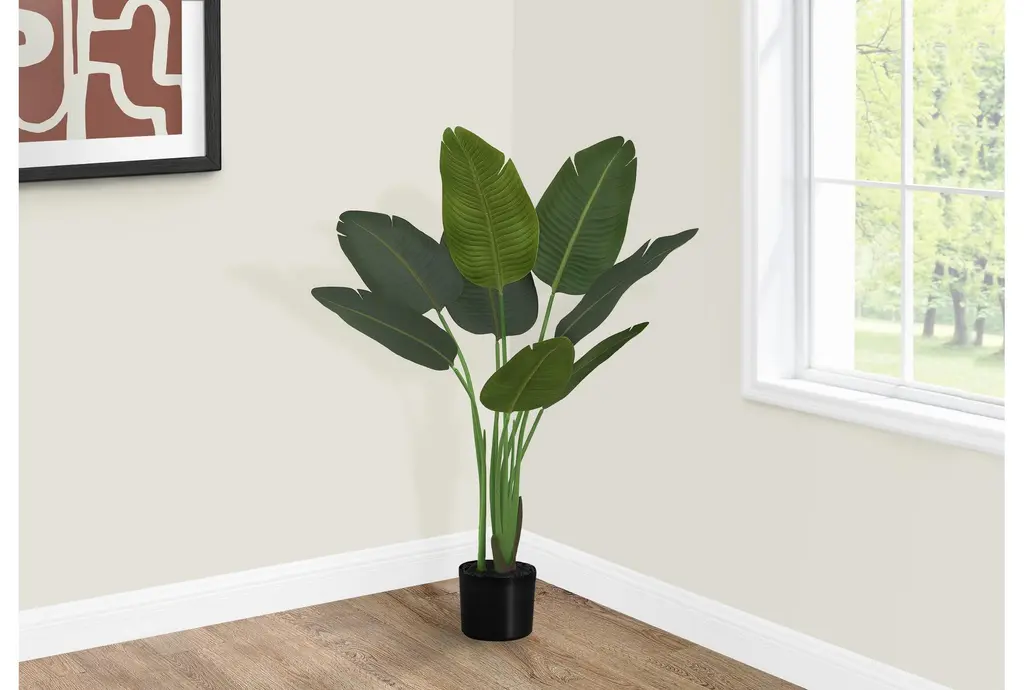 Add some greenery to your space with this 44" tall faux Bird of Paradise tree that is firmly set in a 5" black pot. This decorative indoor floor plant features 8 adjustable green leaves that can be arranged to your liking. This easy-care artificial plant is made from the highest quality materials and requires no maintenance or watering, for a sustainable, environmentally friendly decorative accent that will last a lifetime. No assembly required; product dimensions: 32 in. L x 27 in. W x 44 in. H.