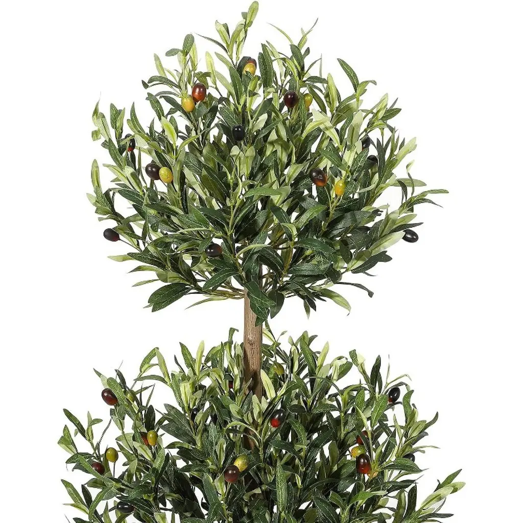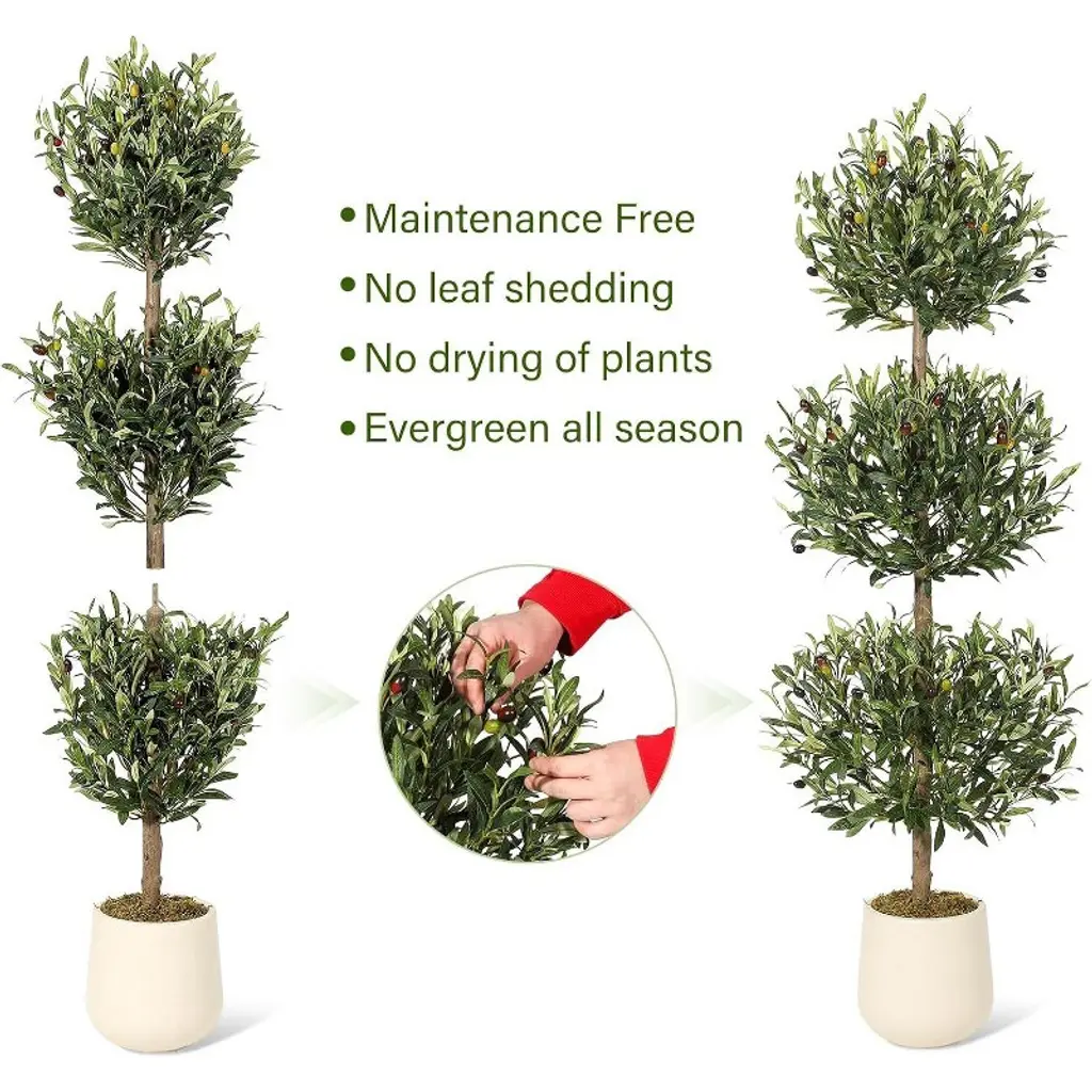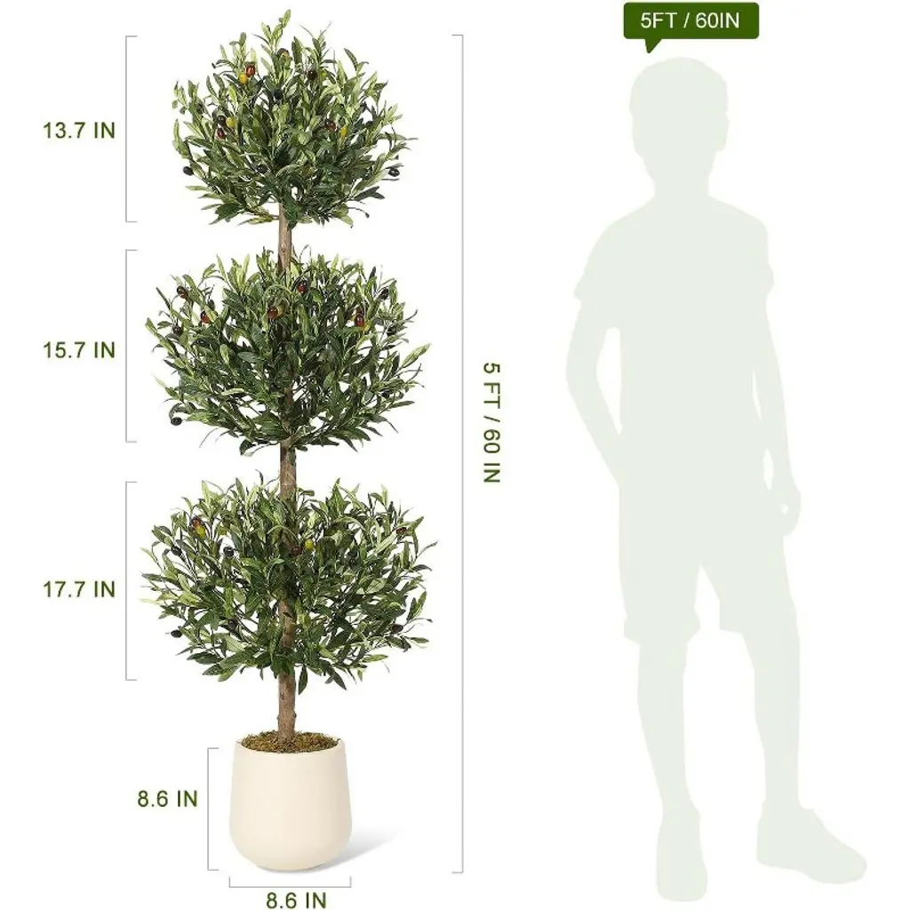 【REALISTIC DESIGN】Our 5FT artificial olive triple ball topiary trees feature lifelike olive leaves, lush moss, and a meticulously crafted inner pot, perfectly mimicking the elegance of real olive shrubs. These realistic fake trees are ideal for adding a natural touch to any space, whether indoor or outdoor. 【VERSATILE STYLING】Standing at 5 feet tall, these faux olive trees are perfect for enhancing porches, entryways, living rooms, offices, or gardens. Their evergreen faux plants design creates a sophisticated and inviting atmosphere, making them a versatile choice for home decor, office plants, or porch decor. 【DURABLE & WEATHER-READY】Made with high-quality UV-resistant materials, these artificial shrubs can withstand all weather conditions—rain, sun, or cold—without fading or damage. Perfect for year-round greenery, they are ideal for both outdoor and indoor use. 【LOW MAINTENANCE】Say goodbye to watering, trimming, or sunlight! These maintenance-free faux olive trees are evergreen, never shed leaves, and require no special care. Perfect for those who love plants but lack time for upkeep, they are a hassle-free addition to any space. 【Easy Assembly】Setup is quick and easy with clear instructions, taking just a few minutes to add this modern, tall floor plant to your home. Ideal for decorating living rooms, patios, or front doors, its versatile design fits seamlessly into any space