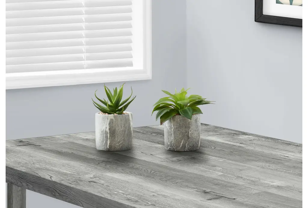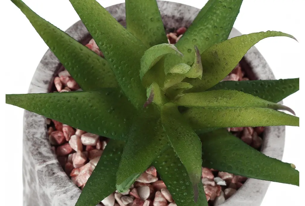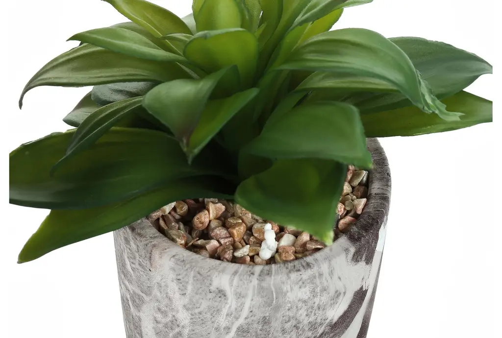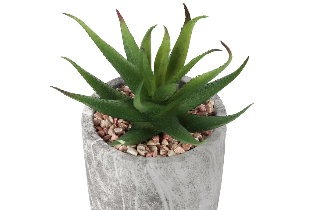 Create your own indoor oasis with this set of 2 artificial indoor succulent plants. Each set includes two 7" tall faux succulents nestled in 4" grey marble-look cement pots with pebbles for an effortless realistic look. These easy-care faux table plants are made from the highest quality materials and require no maintenance or watering, for a sustainable, environmentally friendly decorative accent that will last a lifetime.