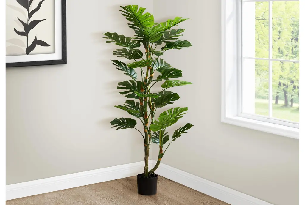 This stylish and fashionable 61" Green Artificial Monstera Tree in a Black Pot is the perfect indoor decorative accent. With its realistic green leaves and high-quality craftsmanship, it adds a touch of greenery to any space without the need for watering. Durable and environmentally friendly, this artificial plant is ideal for both home and office settings.