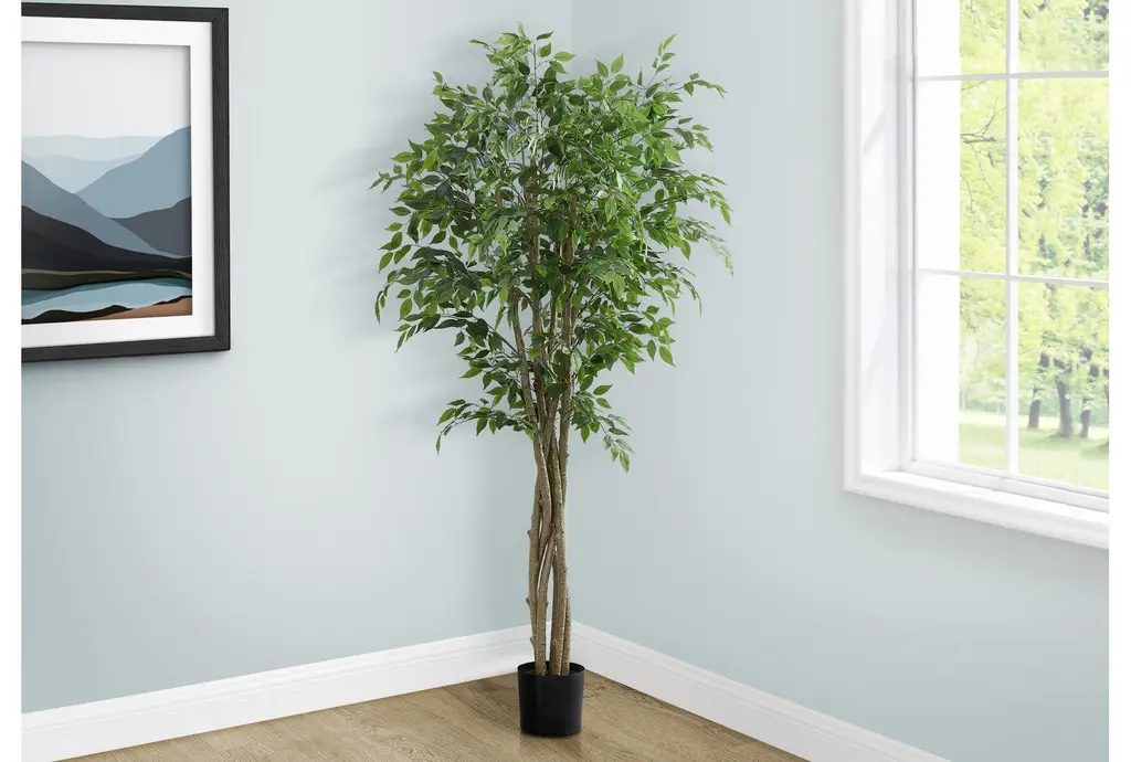 This stylish and fashionable 79" Green Artificial Ficus Tree in Black Pot is perfect for adding a touch of nature to any space. It features 1674 realistic green leaves with a real touch feel and a dual trunk design for added authenticity. High-quality craftsmanship ensures that this durable and environmentally friendly plant will enhance your home or office for years to come.