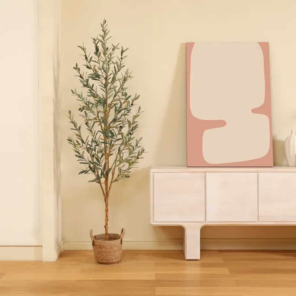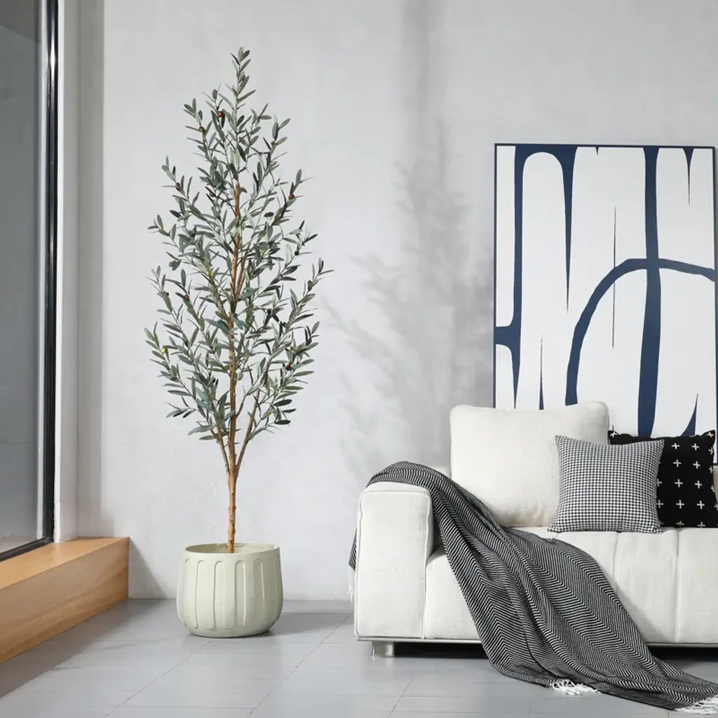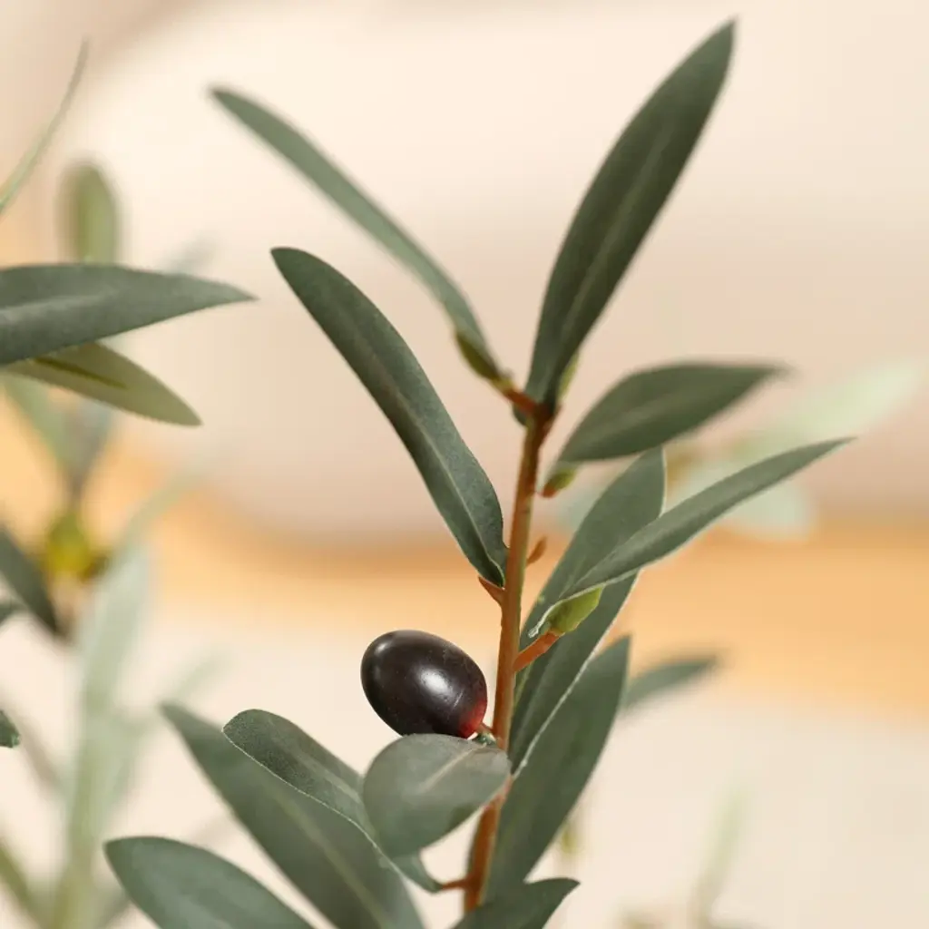 Our Artificial Olive Tree in Black Pot is the perfect home decor for anyone looking for an easy way to spruce up their indoor or outdoor spaces. Made with natural wood and full of lush, green foliage, this big fake plant mimics the look and feel of a real olive tree without any of the hassle. The artificial olive plants are crafted to mimic the exact look of natural olive trees, down to each individual leaf. Whether you're looking to add some life to your living room or bring a touch of the outdoors to your patio, this faux olive tree is perfect for you. The olive tree branches are adjustable and you can easily rearrange them to your liking. Item may need to be reshaped when removed from the box. Overall, this faux olive tree is a prime example of how to elevate your living space and impress your guests effortlessly. Give a new lease of life to your space with our Fake Olive Tree.
