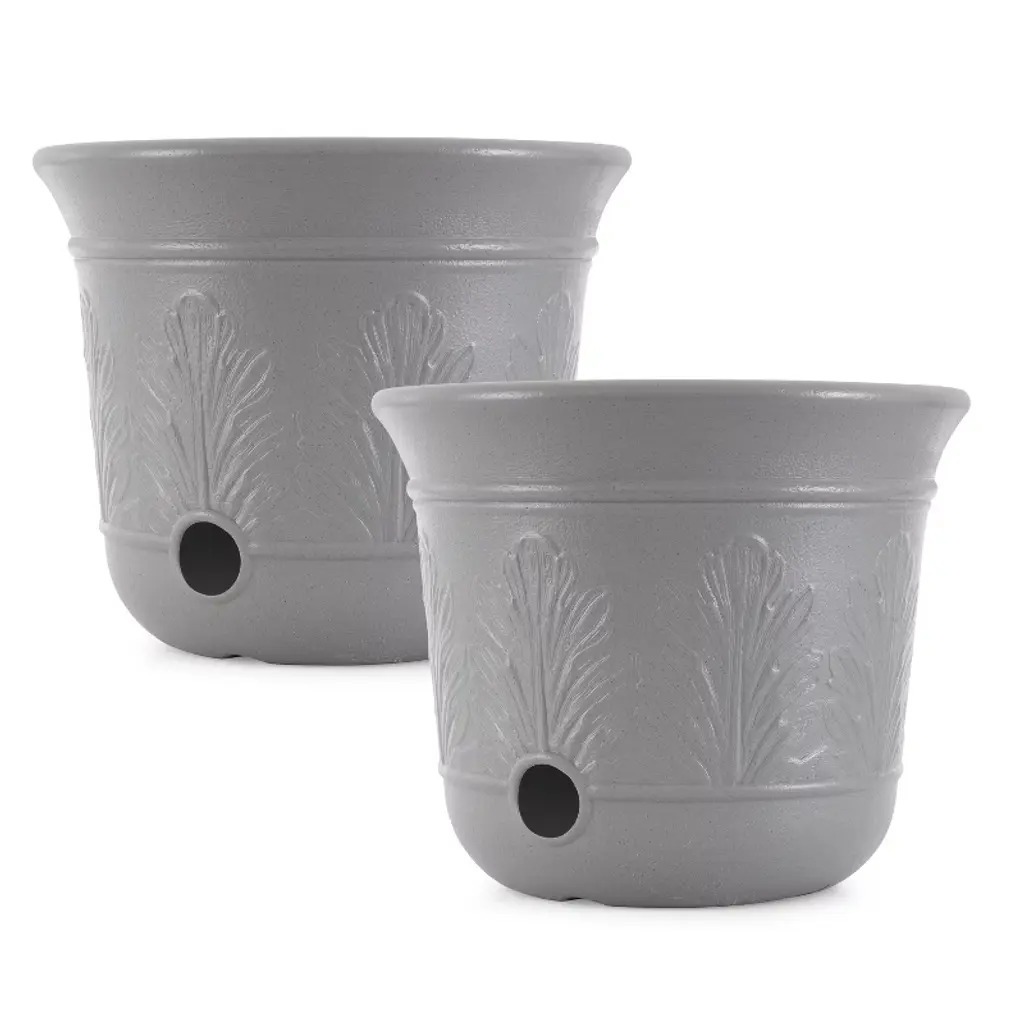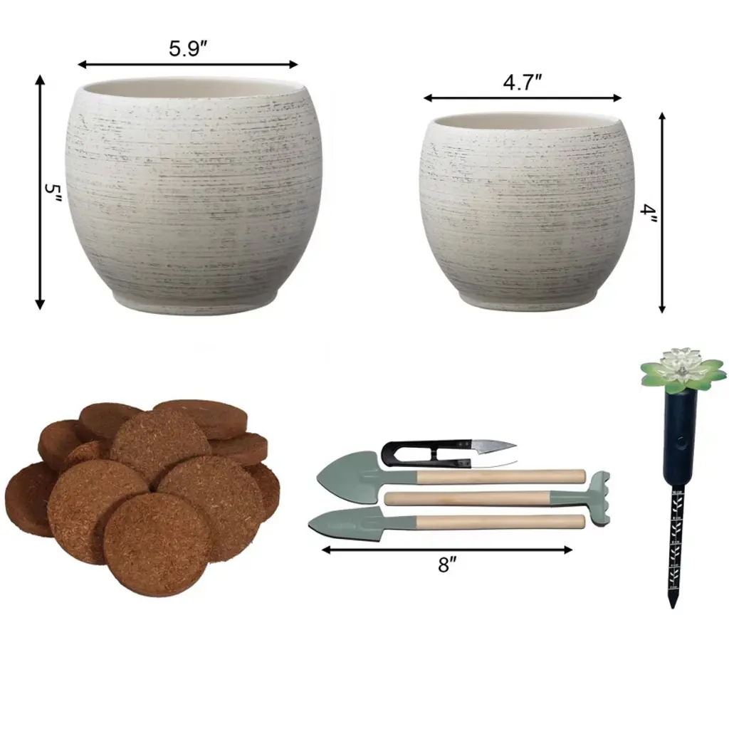 • (1) 4.7" Wood Optics Gray Ceramic Alberta Fashion Pot • (1) 5.9" Wood Optics Gray Ceramic Alberta Fashion Pot • (10) Growlite Premium 20g Coir Discs • (1) Standard Plant Alarm Moisture Meter • (1) 4pc Mini Garden Tool Set Give your indoor greenery the care it deserves with the Alberta Indoor Gardening Kit. Featuring two beautifully crafted ceramic pots with natural wood optic finishes, this set is a stylish and functional way to grow your favorite succulents, herbs, or houseplants. The eco-friendly coir discs provide a sustainable potting medium, while the moisture meter takes the guesswork out of watering. The included 4-piece tool set makes grooming, planting, and repotting a breeze. Perfect for shelves, countertops, or gifting to any plant enthusiast, this kit combines form and function with earthy elegance Pot Dimensions: Small Pot: 4.7” D x 4” H Large Pot: 5.9” D x 5” H