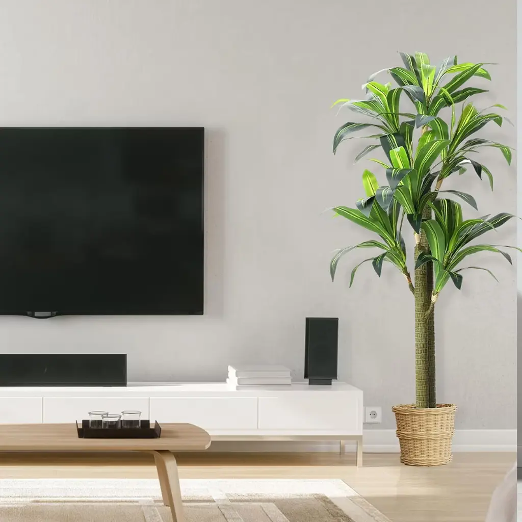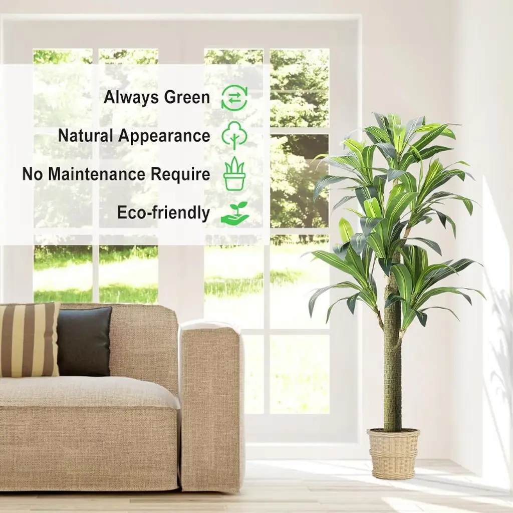 Stand out with a 5.4ft Artificial Dracaena Silk Plant that captures the essence of nature with its detailed and realistic appearance, featuring shiny, arching sword-shaped leaves on stout trunks for a burst of green vitality.Enjoy the beauty of plants without the hassle of upkeep with our artificial dracaena tree that requires no watering or gardening skills, remaining vibrant and green throughout the seasons, a cost-effective and hassle-free decor solution for any space