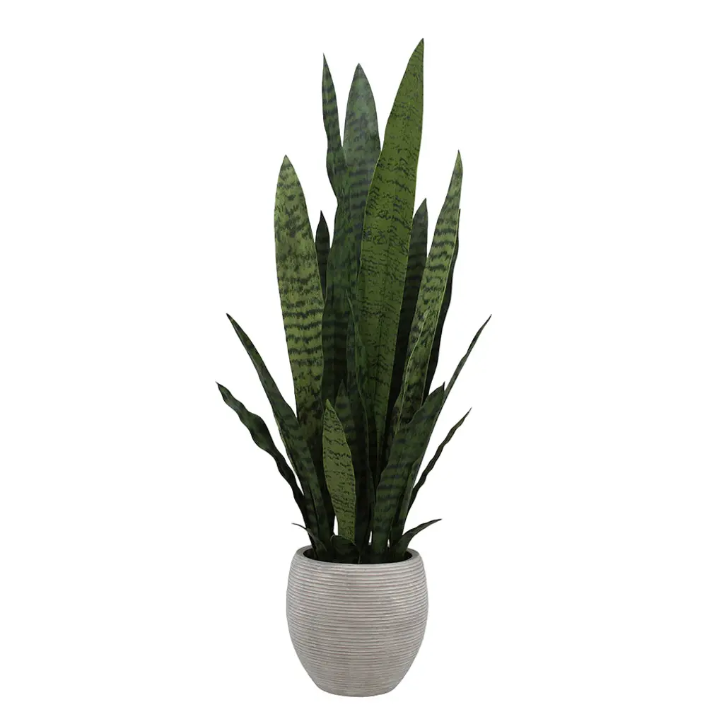 Worry-free greenery. This faux botanical mimics the striking lines and variegated leaves of the sansevieria – without any of the upkeep. This classic snake plant arrives in a neutral pot for easy styling, but feel free to add the planter of your choice.