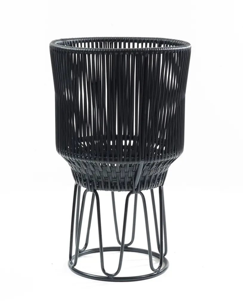 Black circo flower pot 2 by Sebastian HerknerMaterials: Galvanized and powder-coated tubular steel. PVC strings.Technique: Made from recycled plastic. Weaved by local craftspeople in Colombia. Dimensions: Top diameter 40 x height 68 cm Base diameter 30.7 cm Available in colors: olive - menta, honey - sand, purple - carne, black matt - black.The Circo Flower Pot in joyful colors offers a vibrant home to your plants. A design by Sebastian Herkner, the comfortable and lightweight piece captures Colombia's vibrancy and spirit with its intense color contrast of fine webbing and steel frame. The pot comes in four color combinations and four different shapes.Each pot is made in Santa Marta, a city on the Caribbean coast of Colombia, by local craftspeople. They weave the PVC strings, which are made from recycled plastic, around a powder-coated tubular steel frame. The weaving technique the artesanos and artesanas use is called Momposino, a traditional method known for intricate patterns. Just the preparation of all the materials takes 20 days, while the production of each pot takes two days. German designer Sebastian Herkner is a long-term collaborator of Ames and has visited Colombia multiple times to experience the country’s cities, nature and people first hand. He also visited many of the ateliers that Ames has partnered with to learn about the unique traditional crafts of Colombia's regions. A sought-after contemporary designer and recipient of many industry awards, he has worked with many international design brands, creating intriguing pieces that showcase his intuition for interesting material, color, and texture combinations.