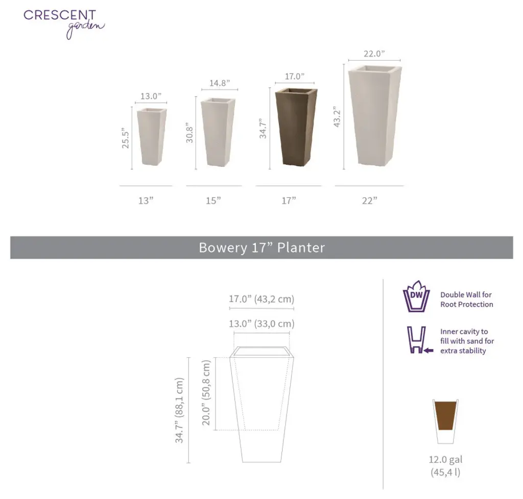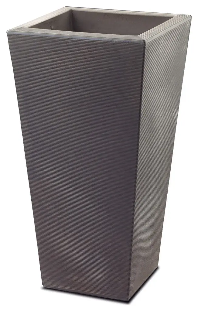 Create a sophisticated look indoors or outdoors by adding tall plants to this textured, square tapered planter. The double-wall feature insulates the roots against the changing temperatures so your plants can thrive. Add a square saucer if you''re keeping your plants indoors for a beautiful look you can enjoy year-round. The 3 different sizes provide you appealing options for grouping these weather-proof and impact-resistant planters. A highlighting feature is the in-built cavity that can be filled with sand for additional stability. Tall double-walled planter is a perfect indoor and outdoor planter. Large soil capacity allows for creating dramatic plant displays. The weather-proof structure ensures the planter won''t fade or crack during extreme temperatures. Sturdy planter shell protected by a 10-year warranty. Constructed with 100% recyclable rotation molded plastic, making it lightweight, chip-resistant and durable.Features a pre-drilled drainage hole for easy planting.In-built cavity that can be filled with sand for extra stability, a much needed feature for windy weather. Inner dimension: 13" W x 20" H ; Soil capacity: 12 gal (48 dry quarts)