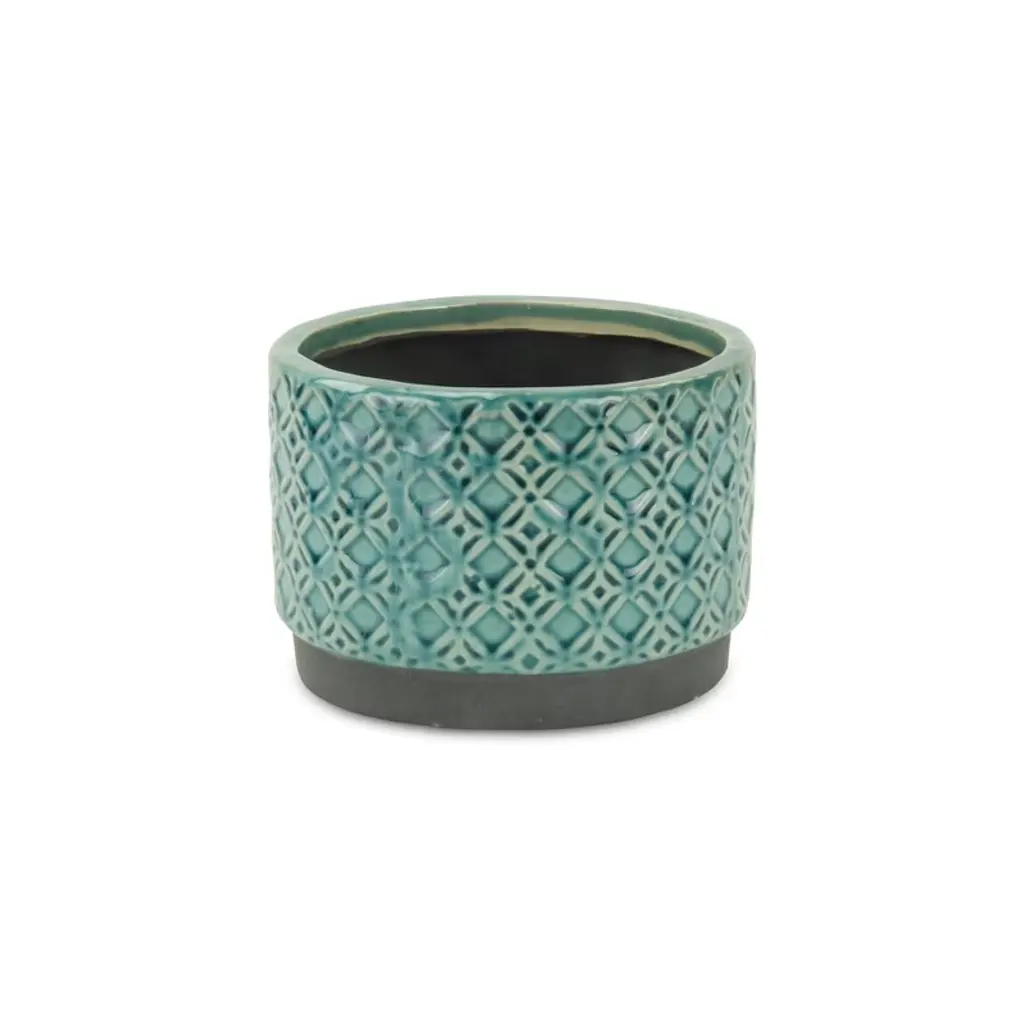 The Turquoise Wide Lattice Pot is an intricate, handcrafted piece. This pot has been glazed in a matte turquoise ceramic and features a lattice design that adds texture and visual interest to this low pot, which can be used indoors or outdoors. Crafted from high-quality ceramic, this beautiful planter is the perfect accent for any space.