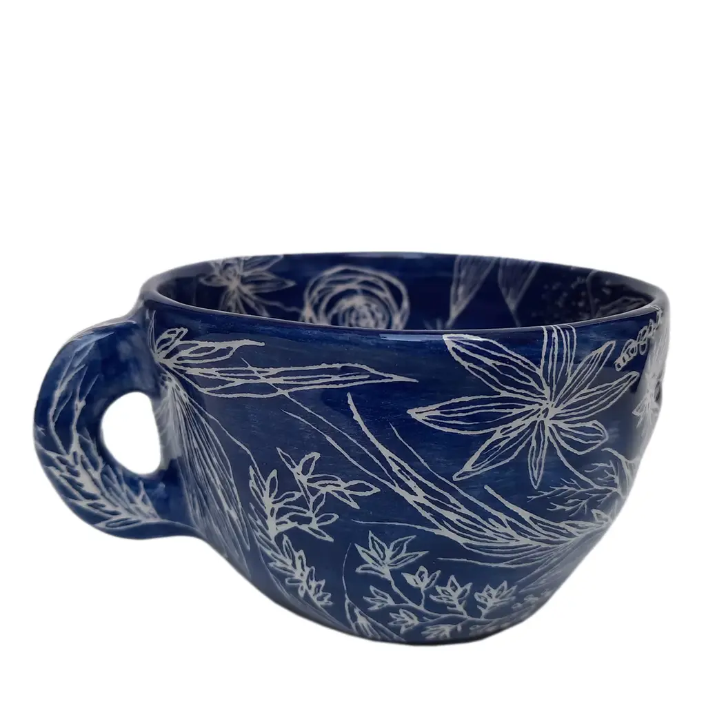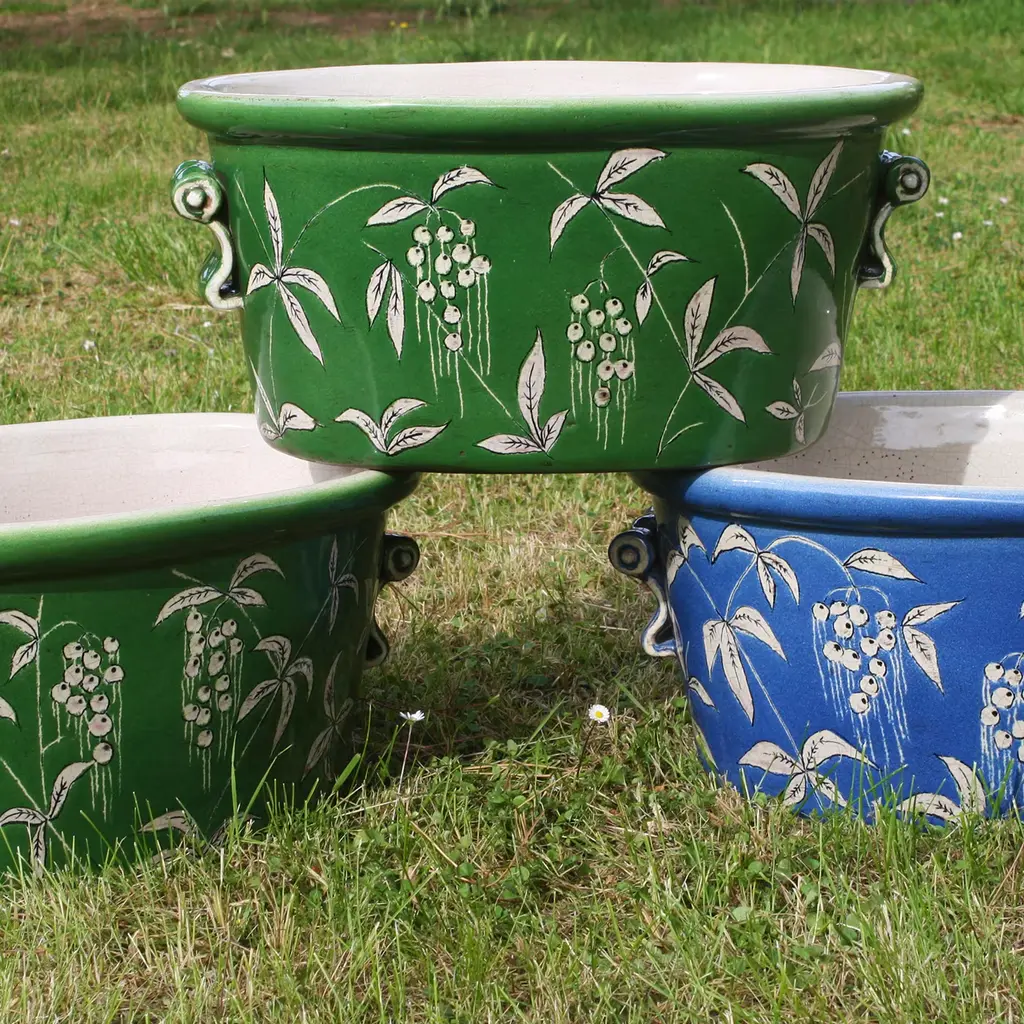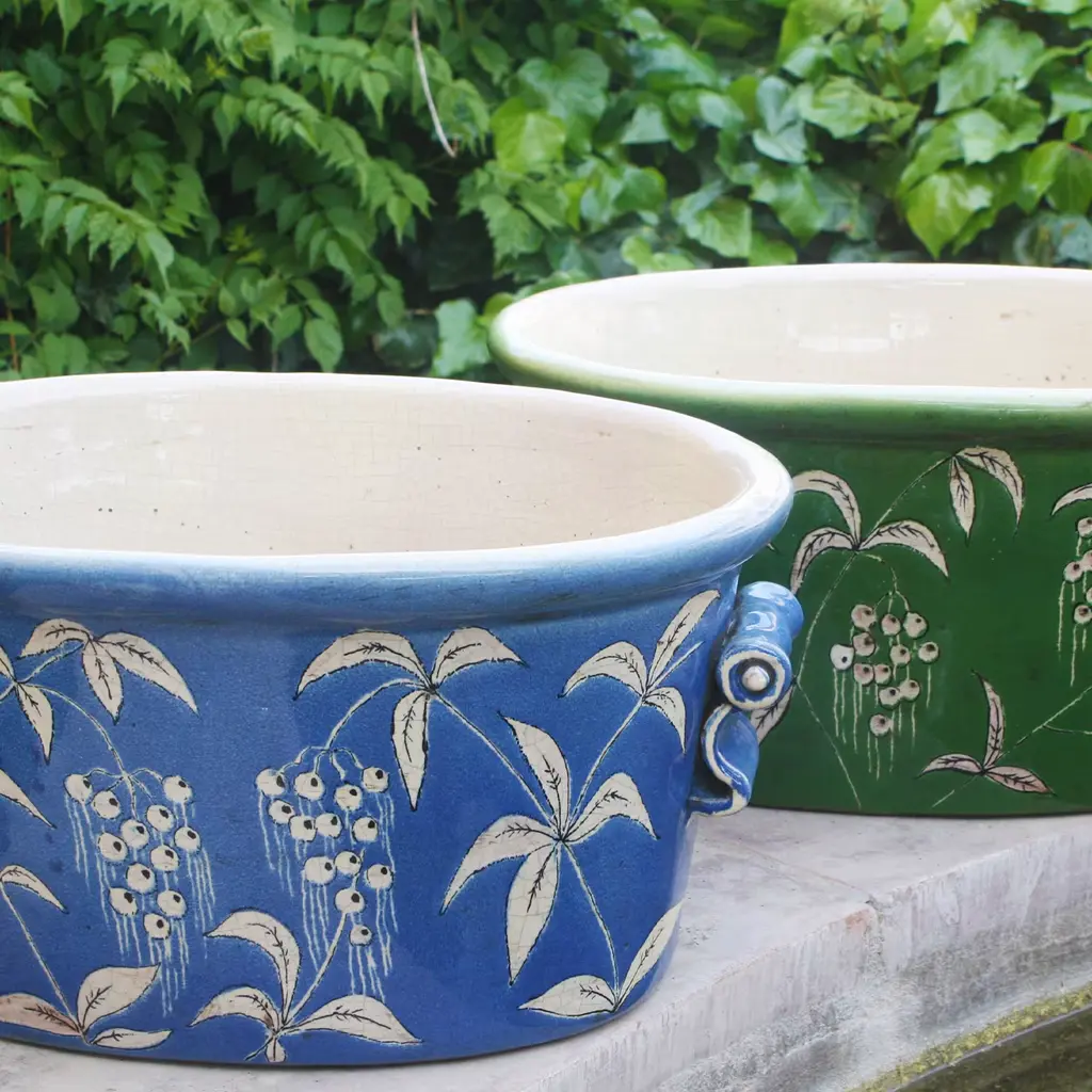 Perfect to host fragrant basil plants or colorful flowers on sunny balconies, this cachepot pairs the signature elegance of ceramic with deft craftsmanship. Sinuous, curled handles are applied to the sides, adding a functional textural twist to the smooth, oval-based body sealed by a bulging rim. A glaze in a bright shade of sky blue accents the exterior, only veiled by a delicate Devonshire-style motif.