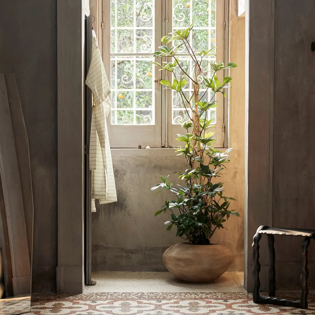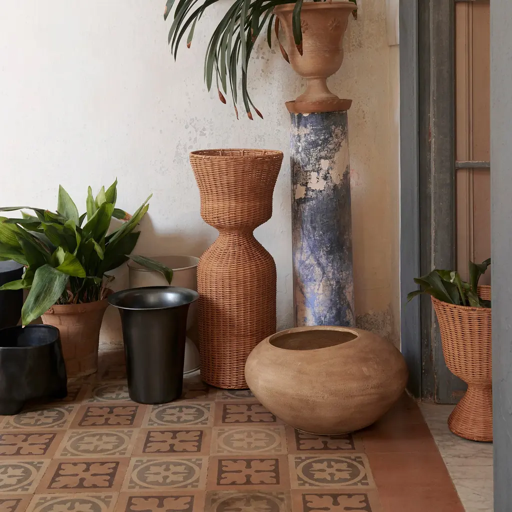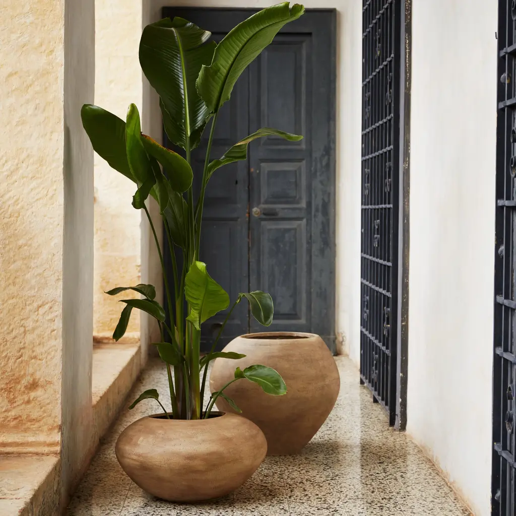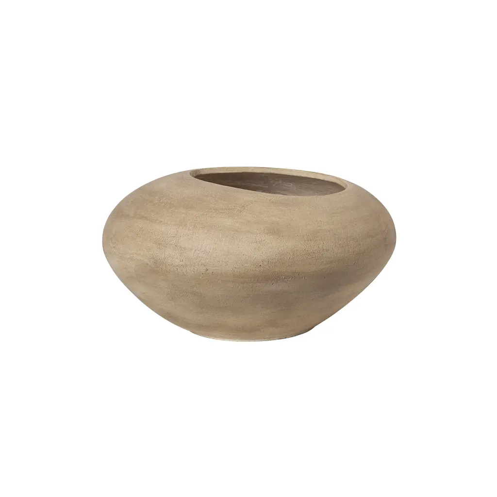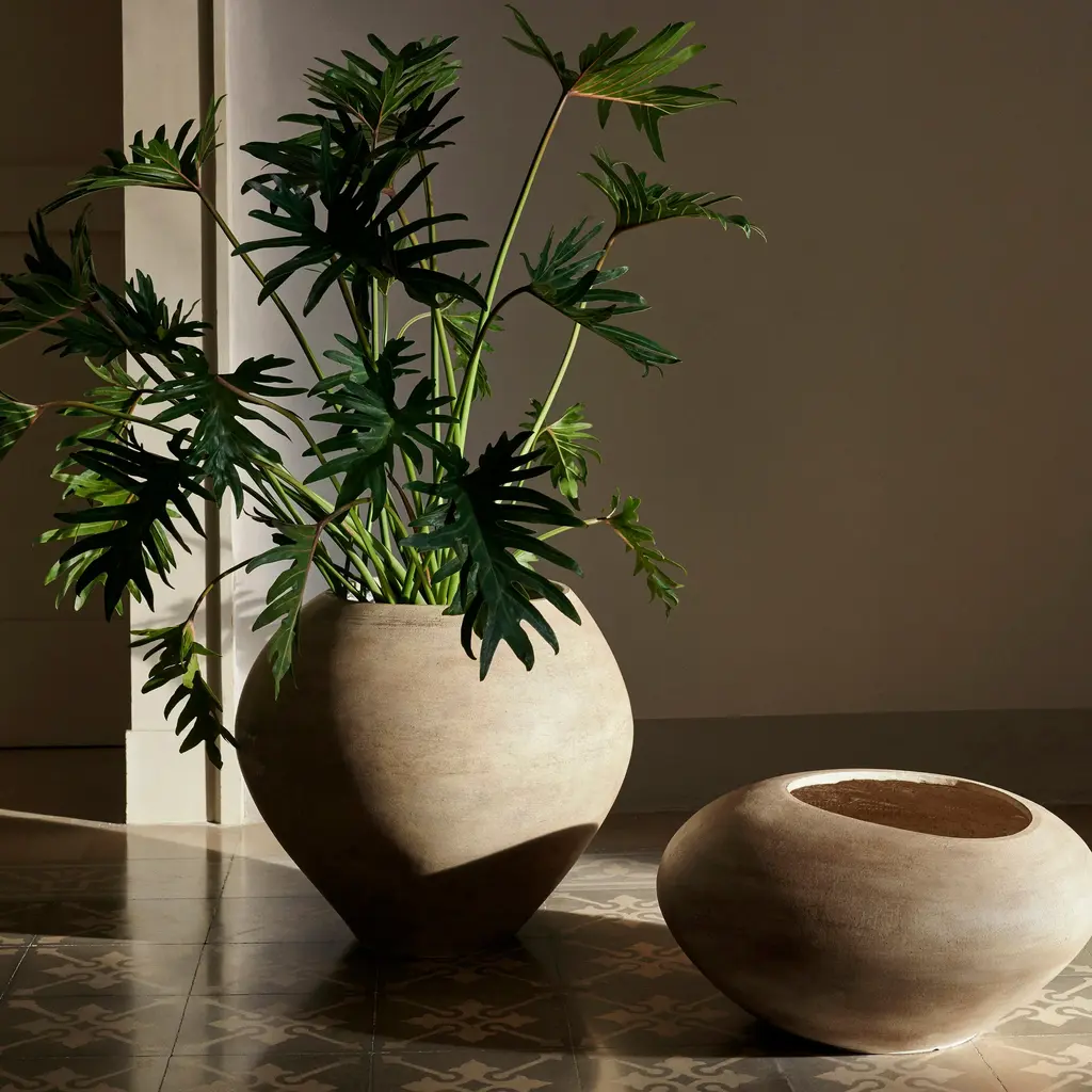 The Dodu Pot, crafted from cement, showcases a rough, tactile surface and an uneven opening. Its curvy shape, balanced on a narrow foot, imparts a grand yet light expression. The name "Dodu" references the French word for chubby, reflecting its voluminous design. Ideal for larger plants and trees, the Dodu Pot is suitable for both indoor and outdoor use. Available in 2 sizes.