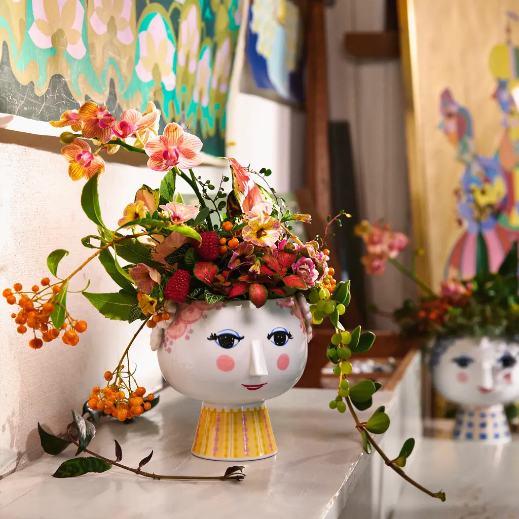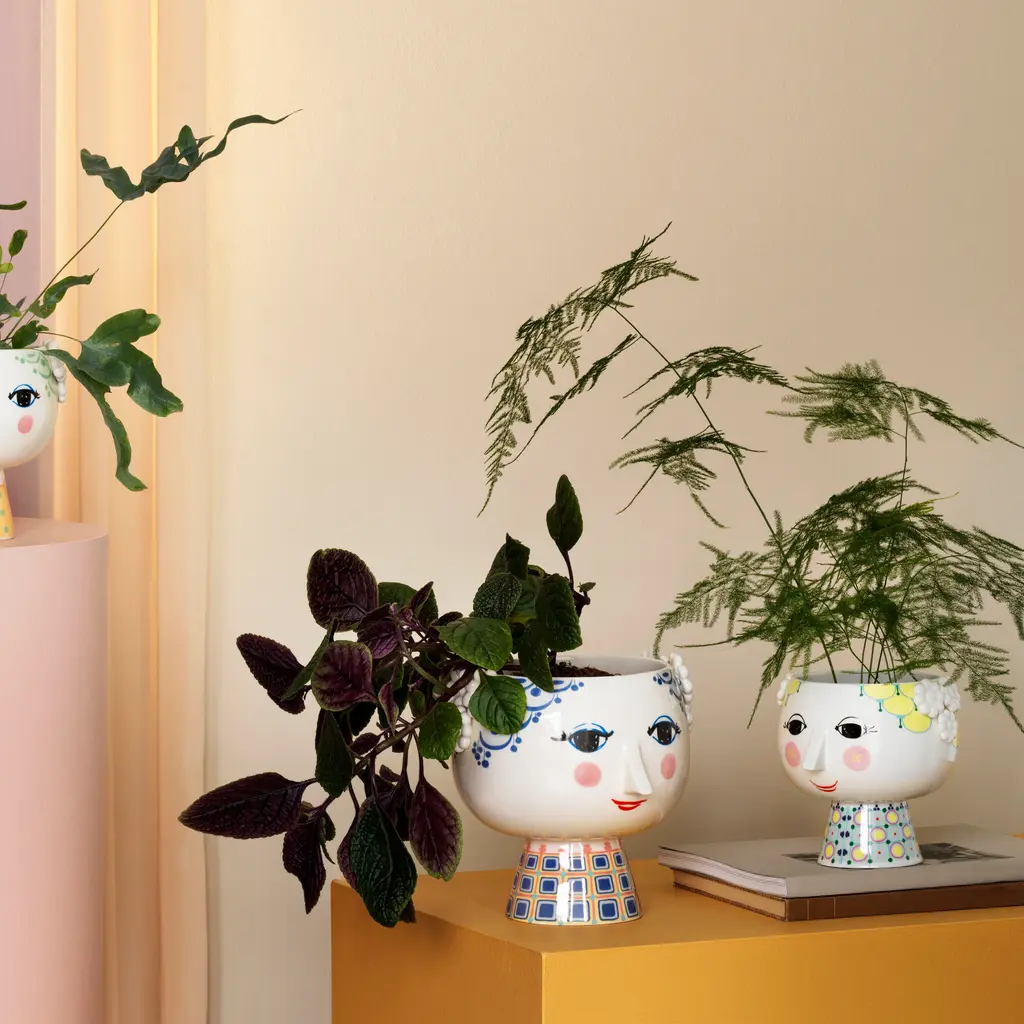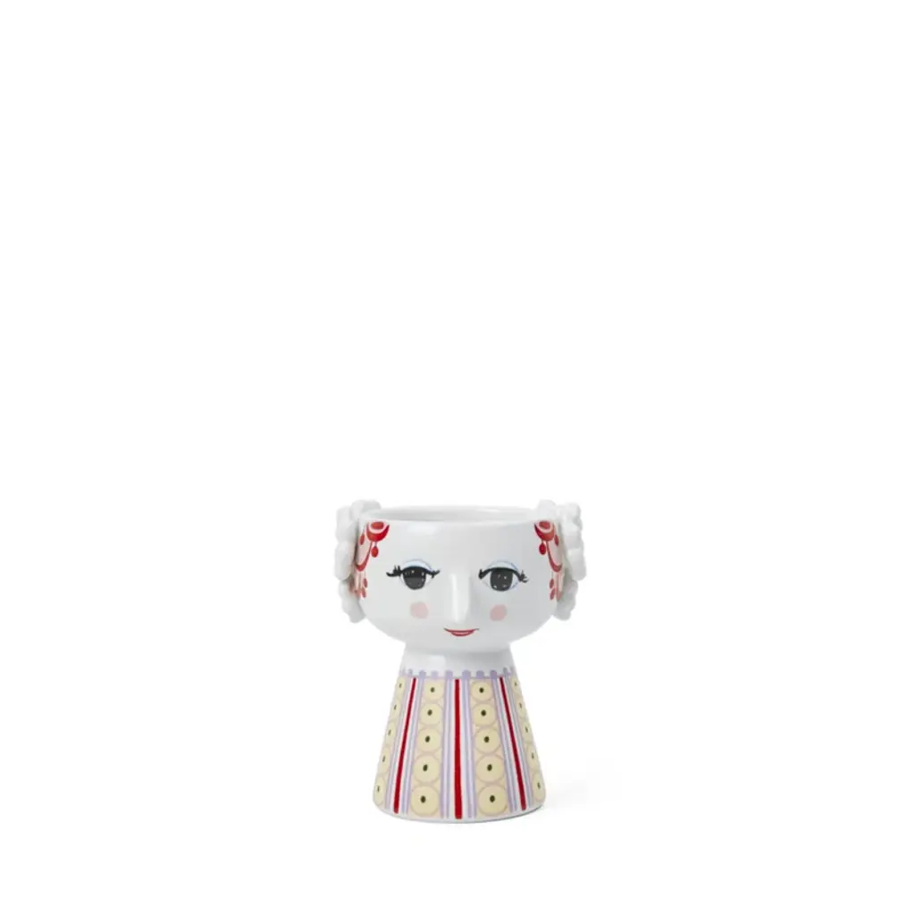 Transform your home into a vibrant and lively space with Bjorn Wiinblad's Eva Flowerpot on Base. Infused with a whimsical joie de vivre, this piece dazzles with colorful adornments hand-painted by artisans. Versatile and beautiful, it can display plants, flowers, or even fruit and candy. Elevate your decor with this vibrant and functional addition. Highlights