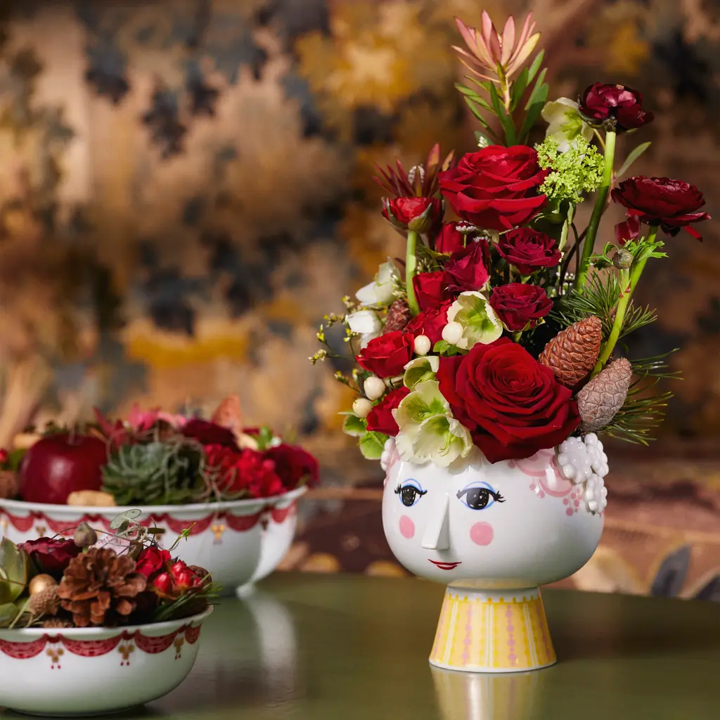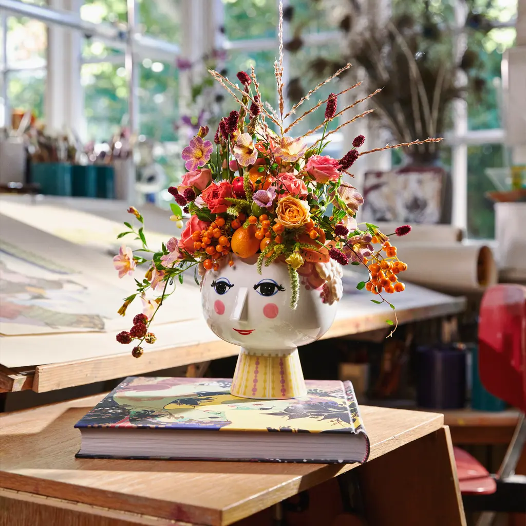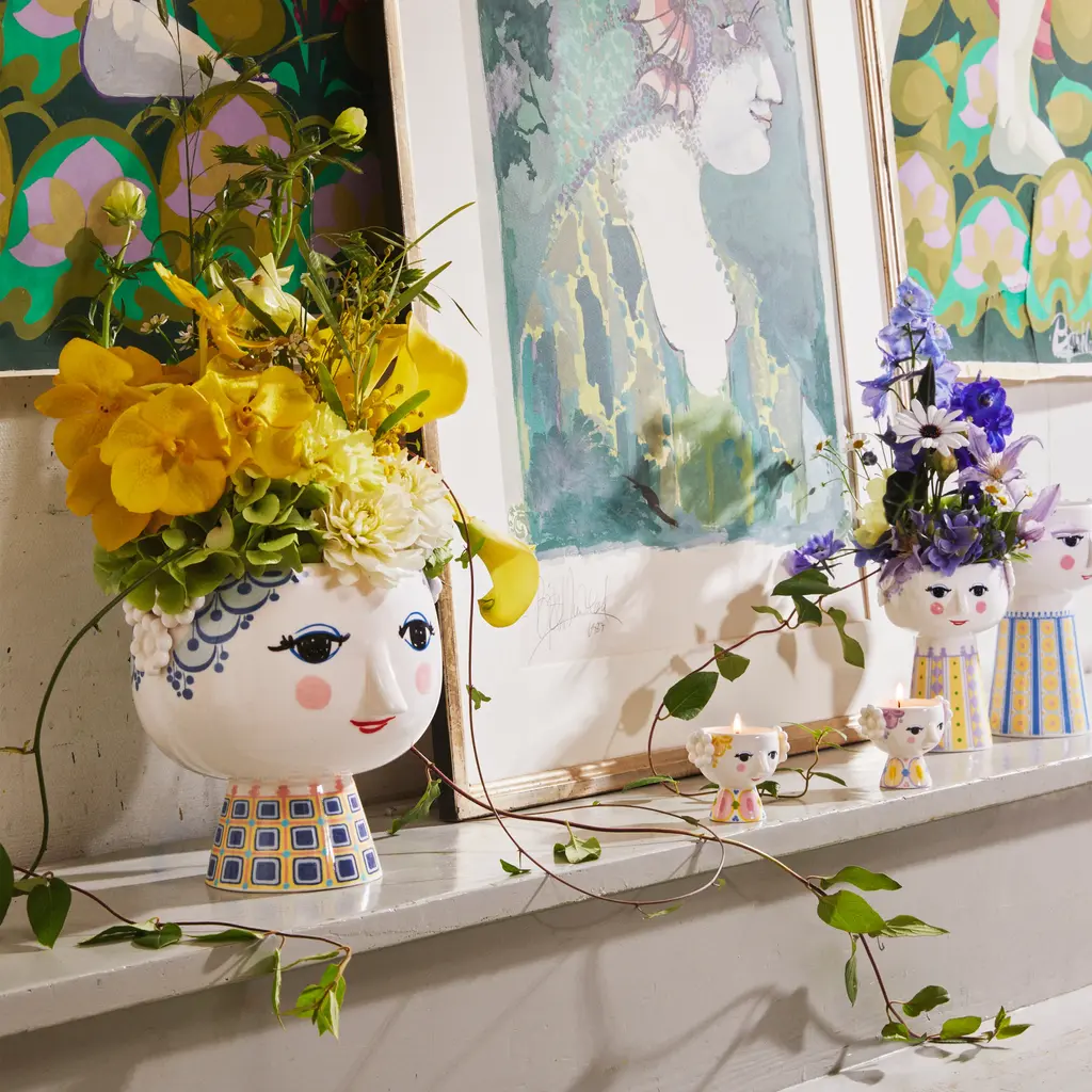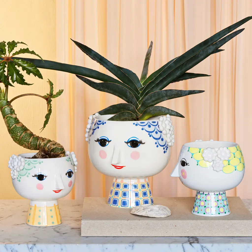 Transform your home into a vibrant and lively space with Bjorn Wiinblad's Eva Flowerpot on Base. Infused with a whimsical joie de vivre, this piece dazzles with colorful adornments hand-painted by artisans. Versatile and beautiful, it can display plants, flowers, or even fruit and candy. Elevate your decor with this vibrant and functional addition. Highlights