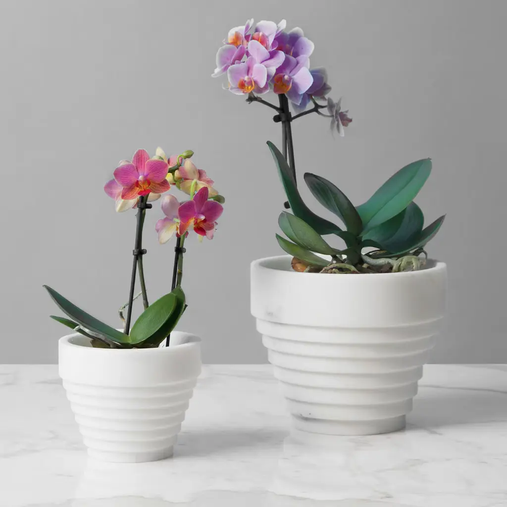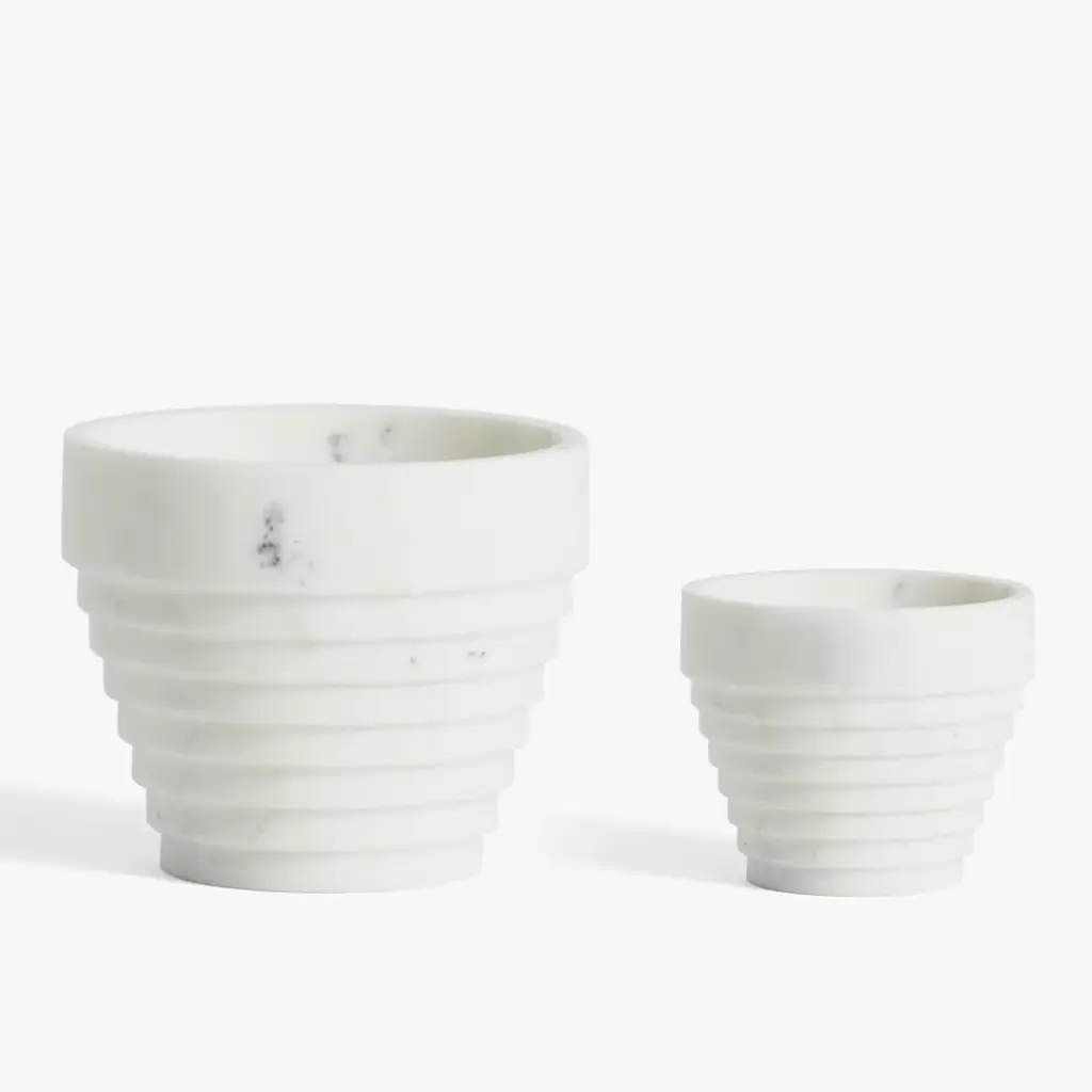 The stately character and voluptuous neatness of the Guggenheim Museum's architecture by Frank Lloyd Wright-inspired designer Michele Chiossi to conceive this delightful pot in white Michelangelo marble. The outer texture reproduces the museum's dynamic facade and appears defined by tiers progressively increasing in diameter while approaching the rim. Any plant or flower arrangement will be elevated by the pot's bright and unique aesthetic. Please note that marbles and stones are natural materials and they can differ also if coming from the same quarry or the same block. The product shown may differ from purchased items. Every piece is unique.