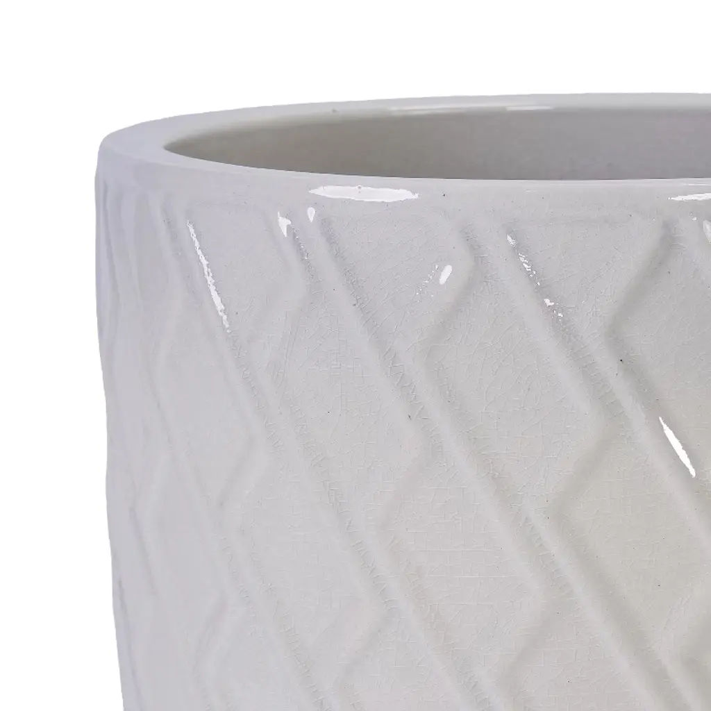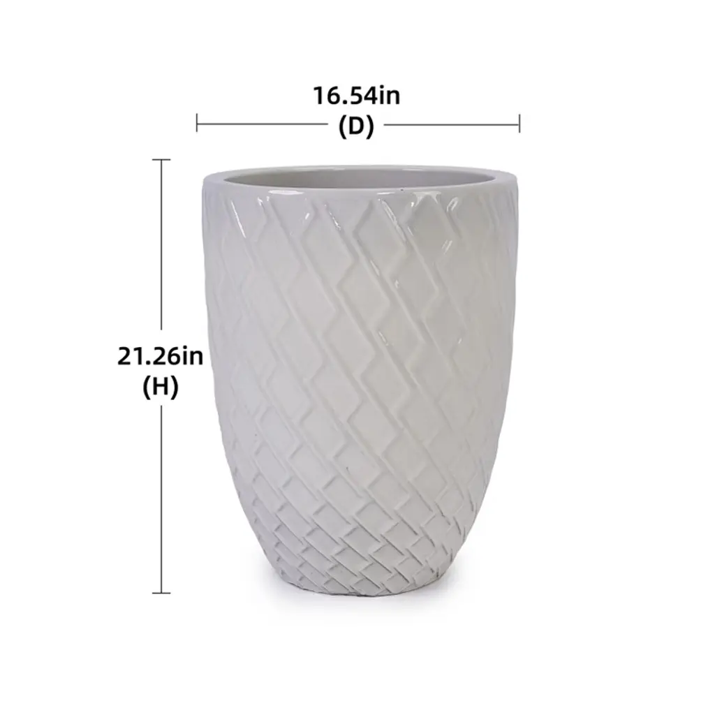 Elevate your home or garden with this striking large ceramic flowerpot, where artisanal craftsmanship meets modern functionality. Its glossy milk white finish, paired with a sleek modern pattern, exudes timeless elegance, effortlessly complementing both contemporary and traditional interiors--whether placed on a patio, in a garden, on a windowsill, or in a living room. Crafted to last, this planter undergoes a meticulous creation process: custom prototypes are hand-carved, followed by high-pressure mold injection (pressure grouting) for precise shaping. Each piece receives individual hand-glazing for consistent coverage, then is fired in an ultra-high-temperature kiln to achieve its final, durable form. The thick, premium ceramic construction ensures it stands up to frost, heat, and harsh weather, making it ideal for year-round indoor or outdoor use. A built-in drainage hole is designed to prevent waterlogging, supporting healthy root development for flowers, herbs, or small greenery, so your plants thrive in style. With dimensions of 16.54"L x16.54"W x21.26"H and a weight of 54.12 lbs, it offers ample space for larger plants or arrangements, serving as a focal point in any setting. Best of all, it arrives fully assembled and ready to use--no setup required. For a personalized touch, customization is available upon request. Whether you're enhancing your outdoor oasis or adding greenery to your living space, this flowerpot combines durability, style, and practicality to elevate your plant display.