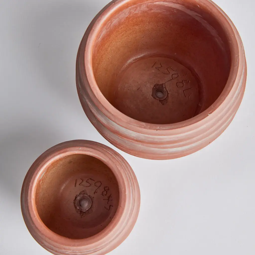 A graphic pattern of concentric circles make this set of pots very mod indeed. The raw, earth washed finish adds a touch of natural warmth. Add your favorite blooms or lush greens and enhance any contemporary space. All-natural concrete. Modern forms. Has drain hole.Set of 2 included: 6 x 6 x 5 and 4.25 x 4.25 x 3.75 inchesBase 4.5" and 3"Use as cachepot or plant directly into. Protect fine furniture by lining interior of pot. Protect from frost and hard freeze.