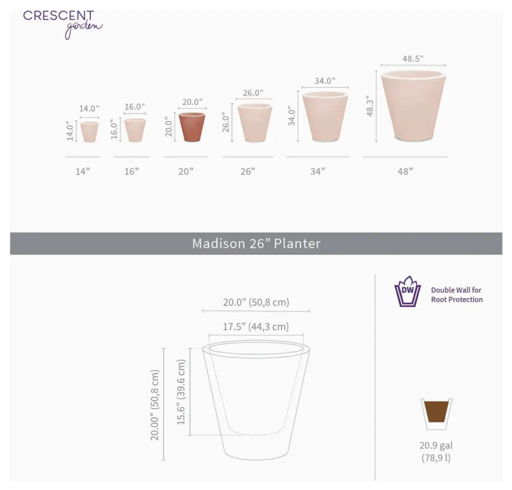 Protect and highlight your plants at the same time with the lightweight Madison Planter from Crescent Garden. This double-wall planter insulates the roots against the changing temperatures so your plants can thrive both in hot summers and cold winters. Pre-drilled drainage holes make sure your plants get just the right amount of water. Add a matching or contrasting saucer if you''re keeping your plants indoors for a beautiful look you can enjoy year-round. - Round, double-walled planter is a perfect indoor and outdoor planter for your plants.- Constructed with 100% recyclable rotation molded polyethylene, making it lightweight, chip-resistant and durable. - The weather-proof planter structure, backed by a 10-year warranty, ensures the planter won''t fade or crack during extreme temperatures.- Features a pre-drilled drainage hole for easy planting. - Inner dimension: 17.46" W x 15.6" H ; Soil capacity: 10.7 gal