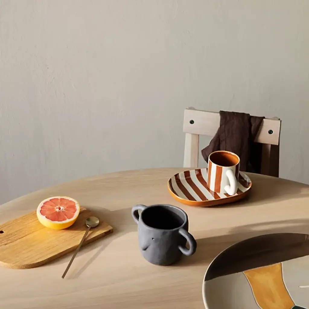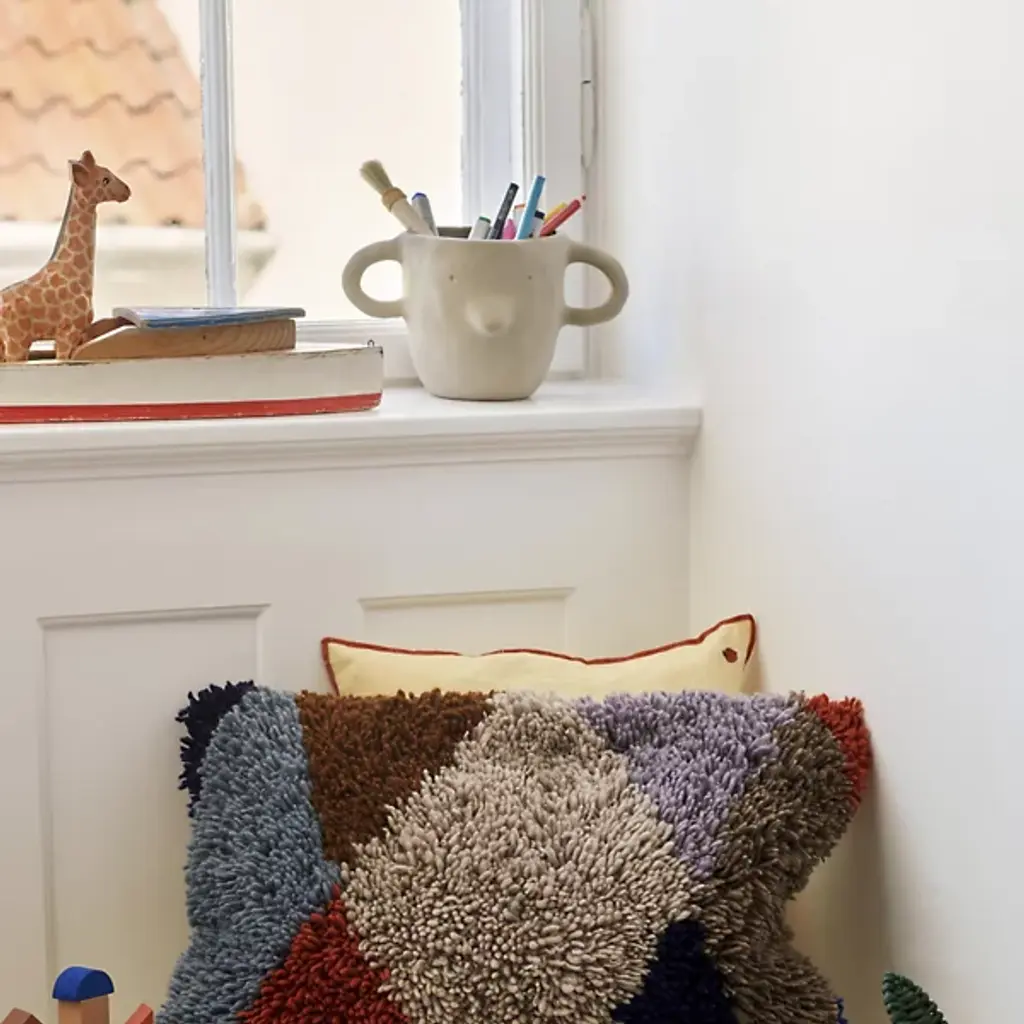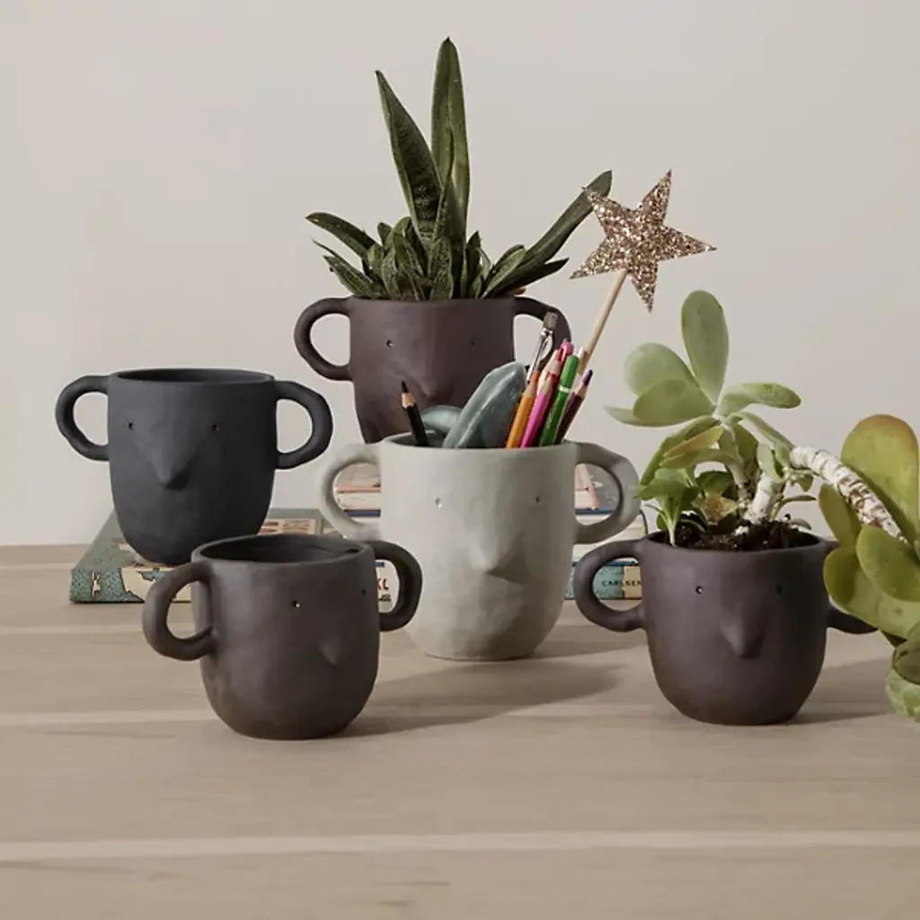Fabulous and friendly, the Mus Plant Pot from Ferm LIVING offers stylish storage for toys, plants, and more on a desk or shelf. Inspired by the Danish name meaning "mouse," it resembles a stylized mouse with its pointy nose and ear-like handles. This pot features an unglazed exterior contrasted by a glazed interior, coordinating with Contemporary and Artisanal Modern styles and adding a playful yet sophisticated touch to any space.