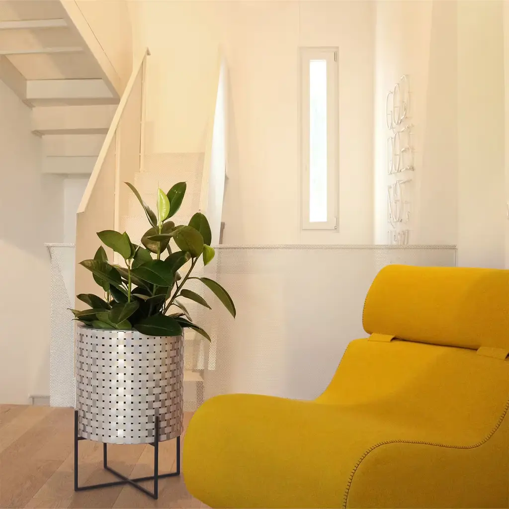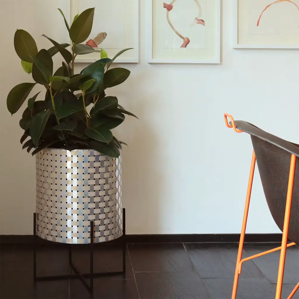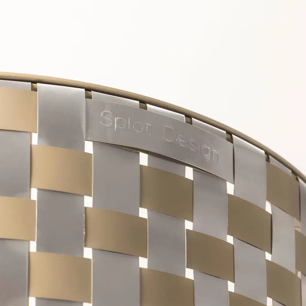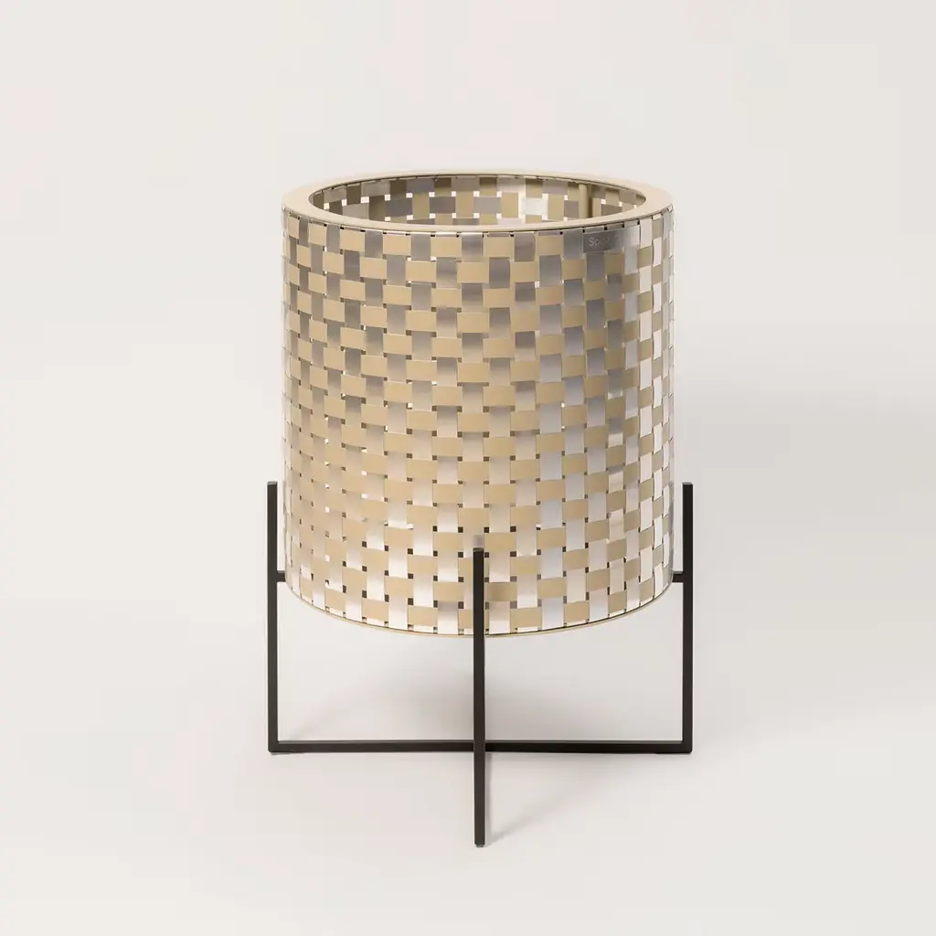 Part of a collection of refined cachepot designed for indoor and outdoor use, Nexum features a black-painted, iron-crossed stand (height 10cm) supporting a cylindrical vase holder. The internal steel lining is covered with a shimmering exterior with an optical texture achieved by weaving gold-finished and natural aluminum foils in an alternating pattern. This handmade weave, aptly called Splot, is an exclusive creation by Inthegarden Design Studio inspired by the Optical Art of the 60's. Available in three different sizes and finishes, please contact the Concierge for details.