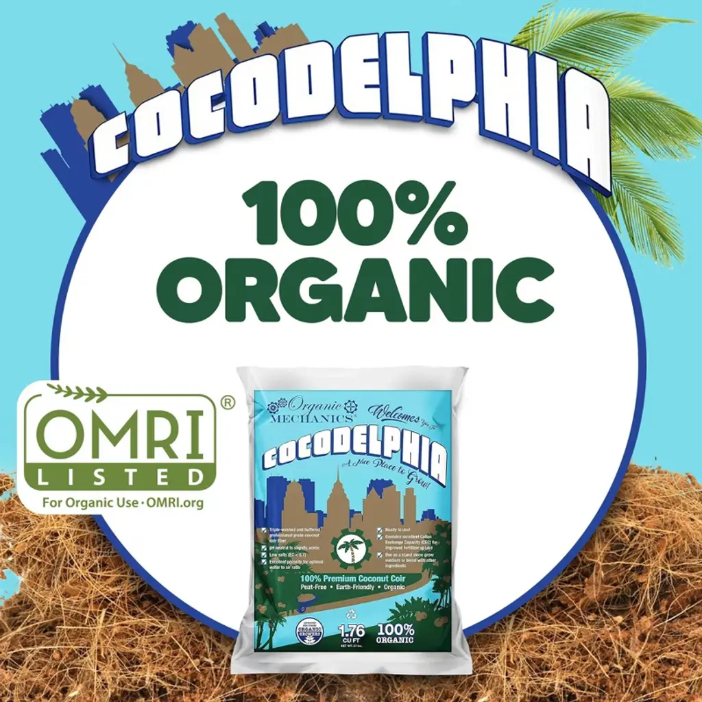 Organic Mechanics Cocodelphia is 100% premium pure coconut coir. Triple washed and buffered, this professional grade coco is ready to use right out of the bag. Excellent porosity for optimal water to air ratio. Contains excellent Cation Exchange Capacity (CEC) for increased nutrient uptake. If desired, mix in beneficial ingredients, such as our Biochar Blend, Insect Frass, Fuhgeddaboudit! Root Zone Feeder Packs, or Worm Castings. If growing in pure coco, make sure to use a calcium and magnesium supplement for best results. Low salt levels less than 0.7. Organic Mechanics compost- based soils do not break down as quickly as peat-based mixes. Simply fluff the mix back up, remove any large root balls, and replant.