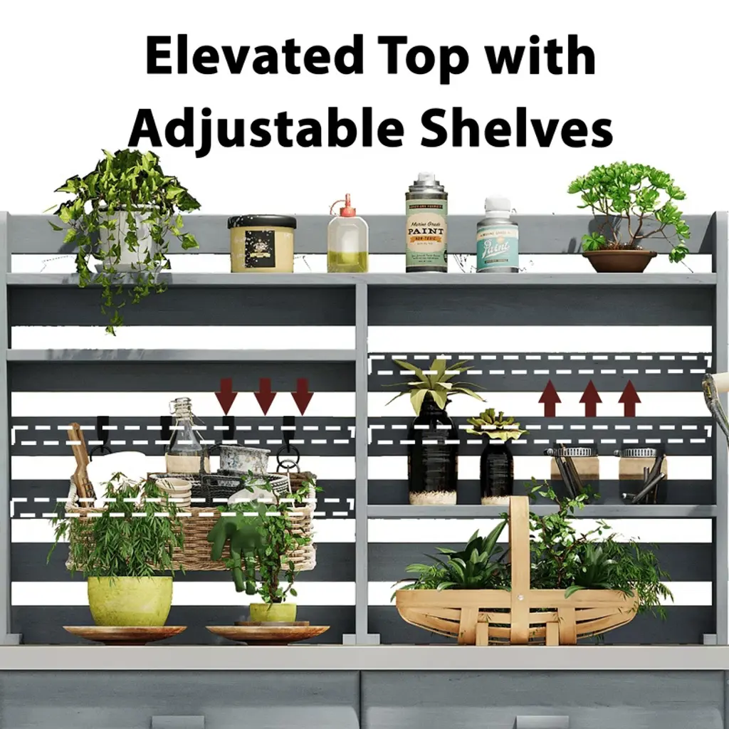Upgrade your outdoor workspace with the ORRD 64.9"H Grey-Blue Potting Bench Table. Made from solid wood with a durable stainless steel top, this versatile table serves as both a gardening station and an outdoor kitchen island. The upper hutch offers extra storage for tools, plants, or kitchen essentials, while the built-in towel rack keeps items within easy reach. Lockable wheels provide mobility and stability, making it perfect for grilling, garden tasks, or organizing your backyard. Its stylish grey-blue finish adds a modern yet rustic touch to any patio or lawn.