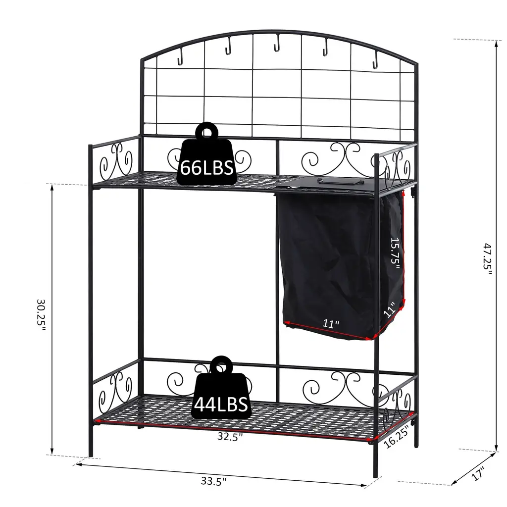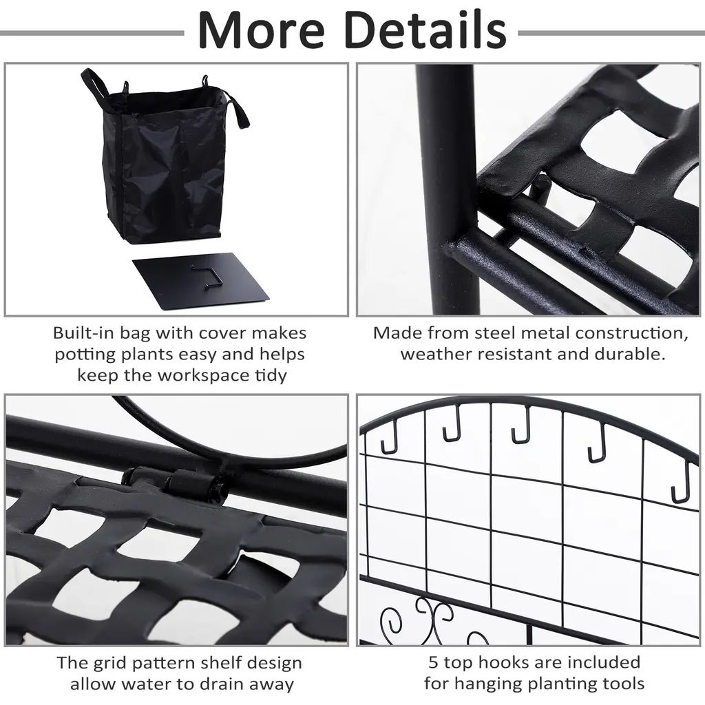 This outside potting bench adds beauty to your space with a charming boho style and special detailing that offers an elegant touch. A built-in bag and cover are included to make potting plants a breeze. A spacious tabletop and lower shelf add convenience, with the bottom section providing a capacity for larger items or a widespread array of stuff, and the upper area creating a bigger workspace. A grid pattern on the back panel ensures easy access to your tools, while including five hooks that can hold belongings without taking up flat surface space. Collapse the structure for easy storage and transport. The raised height saves your back and knees during those long hours spent working outside.Features:Specifications: