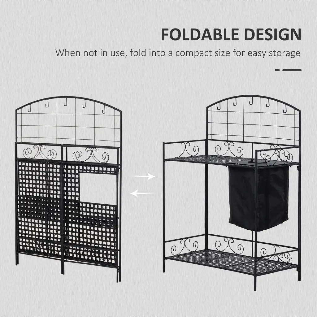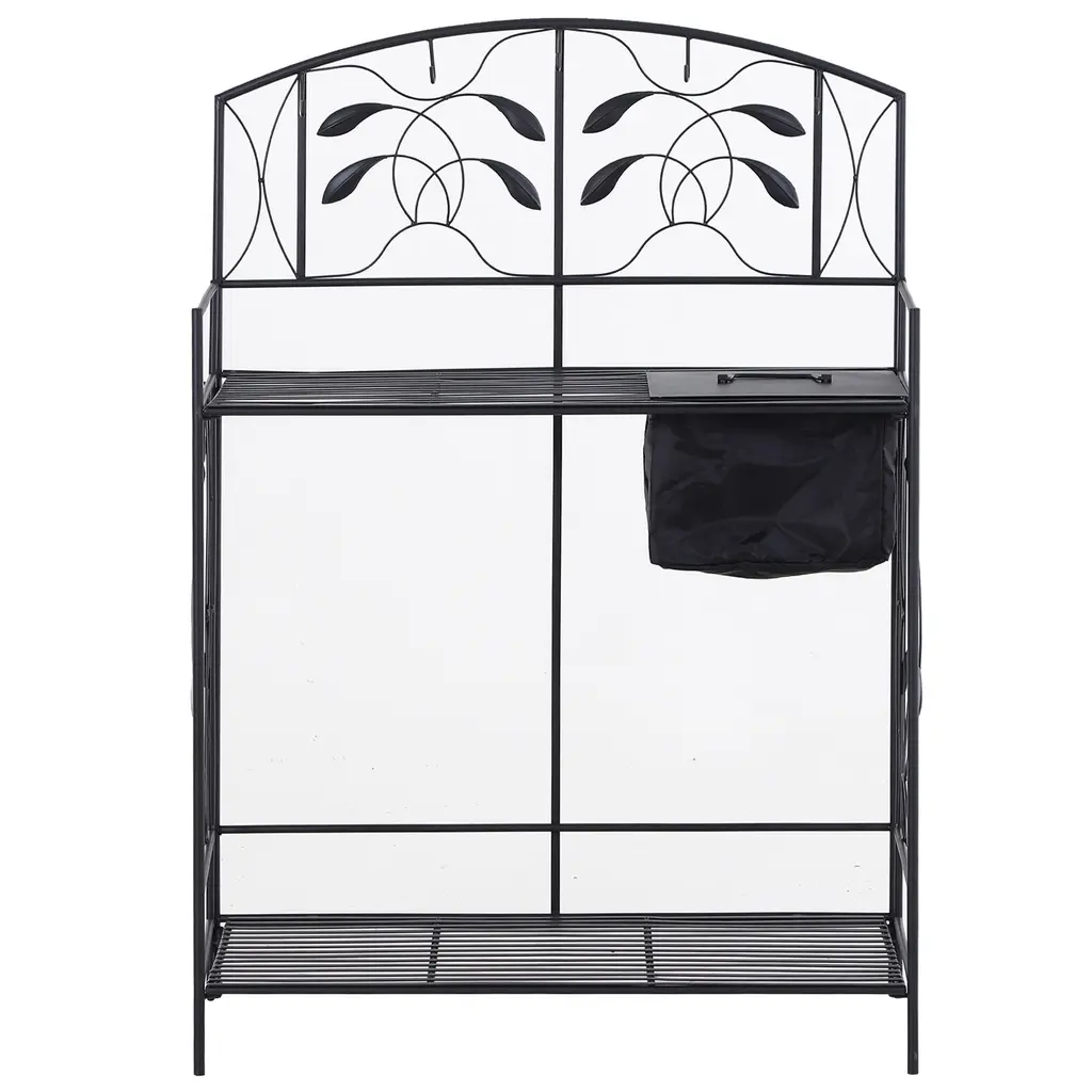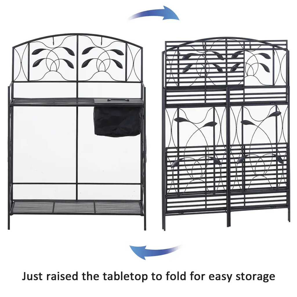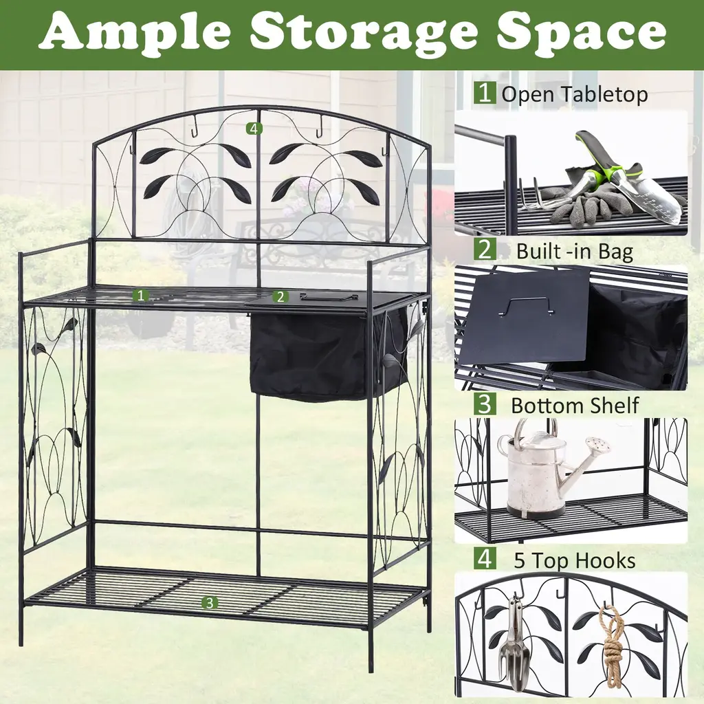 This outside potting bench adds beauty to your space with a charming boho style and special detailing that offers an elegant touch. A built-in bag and cover are included to make potting plants a breeze. A spacious tabletop and lower shelf add convenience, with the bottom section providing a capacity for larger items or a widespread array of stuff, and the upper area creating a bigger workspace. A grid pattern on the back panel ensures easy access to your tools, while including five hooks that can hold belongings without taking up flat surface space. Collapse the structure for easy storage and transport. The raised height saves your back and knees during those long hours spent working outside.Features:Specifications: