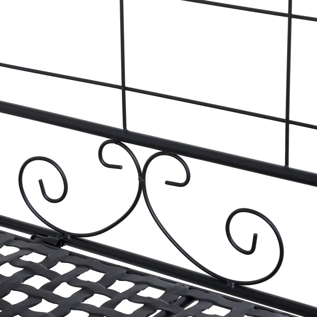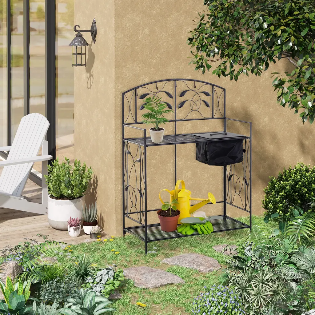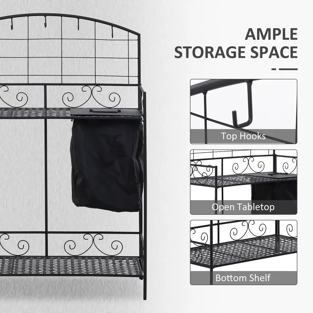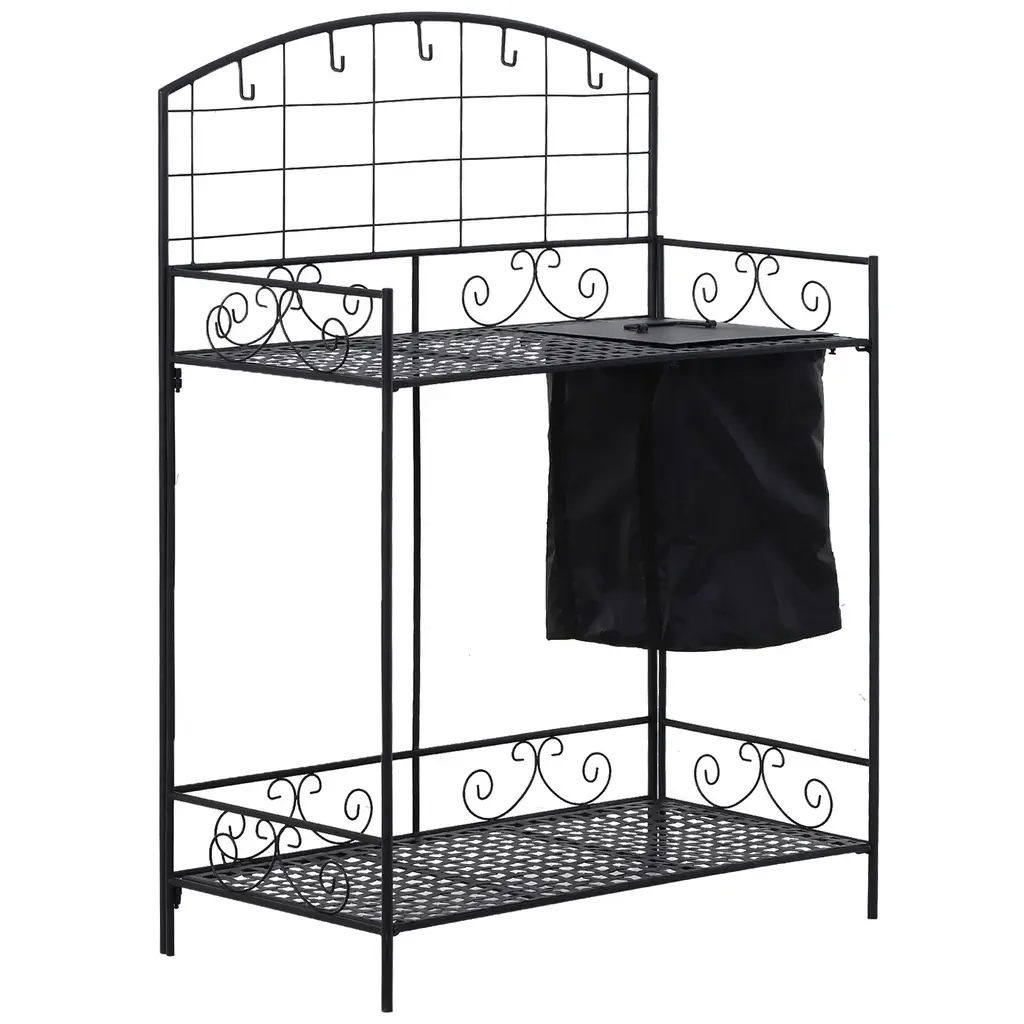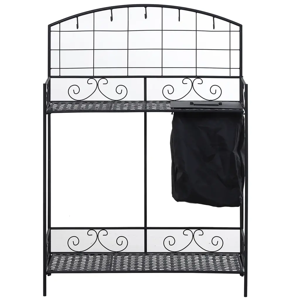 This outside potting bench adds beauty to your space with a charming boho style and special detailing that offers an elegant touch. A built-in bag and cover are included to make potting plants a breeze. A spacious tabletop and lower shelf add convenience, with the bottom section providing a capacity for larger items or a widespread array of stuff, and the upper area creating a bigger workspace. A grid pattern on the back panel ensures easy access to your tools, while including five hooks that can hold belongings without taking up flat surface space. Collapse the structure for easy storage and transport. The raised height saves your back and knees during those long hours spent working outside.Features:Specifications: