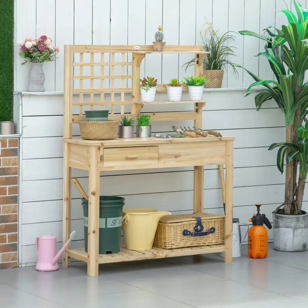 Outsunny Potting Bench Table, Garden Work Bench, Outdoor Wooden Workstation With Tiers Of Shelves And Drawer For Patio, Courtyards, Balcony, Natural
