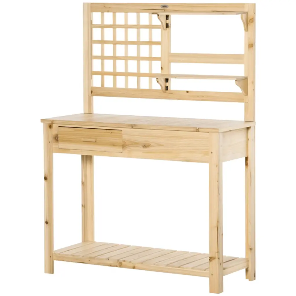 This outdoor potting bench from Outsunny has a simple appearance yet flexible functionality and would be an excellent addition to your garden. Made with solid wood, the planting table looks natural in any outdoor setting. The back panel can be used to attach vines or decorations. The two shelves and drawers provide storage for pots, tools, and seeds. Add convenience and space to your yard with our outdoor gardening tables.