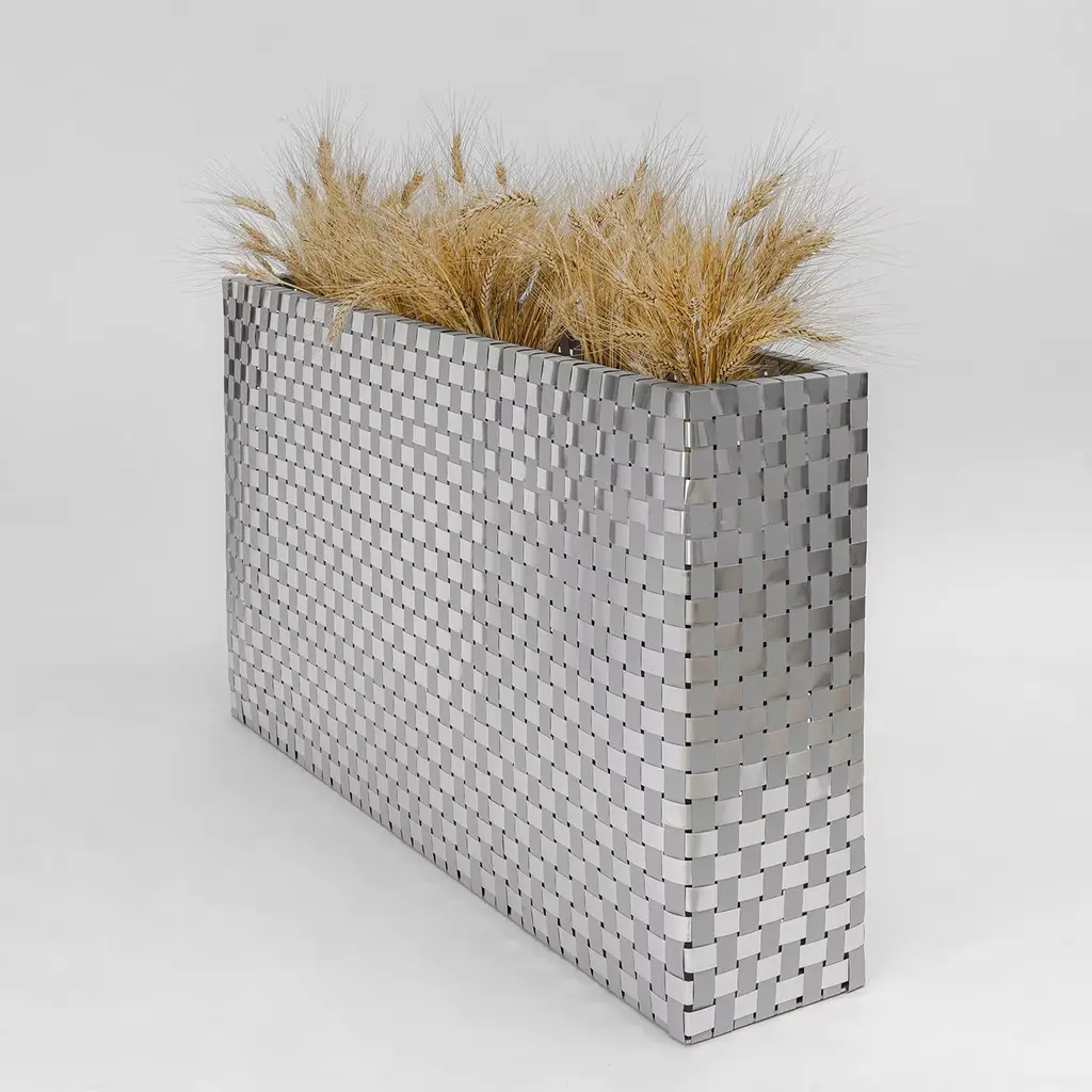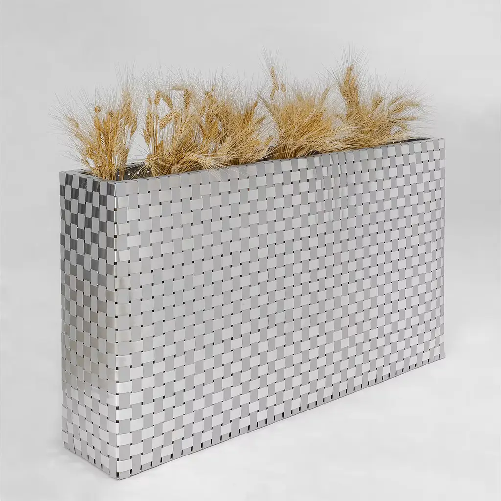 This rectangular cachepot belongs to the Tibi Petre collection. It is characterized by a fine design, with the particularity of a metal weave in which shiny and opaque aluminum is woven, creating plays of light, ideal for indoor as well as outdoor spaces. Its internal stainless steel structure is 16 cm high and inside we find several elements on which vases can be placed. It is a versatile object that can be used as a decorative planter but also as a divider of indoor and outdoor spaces.