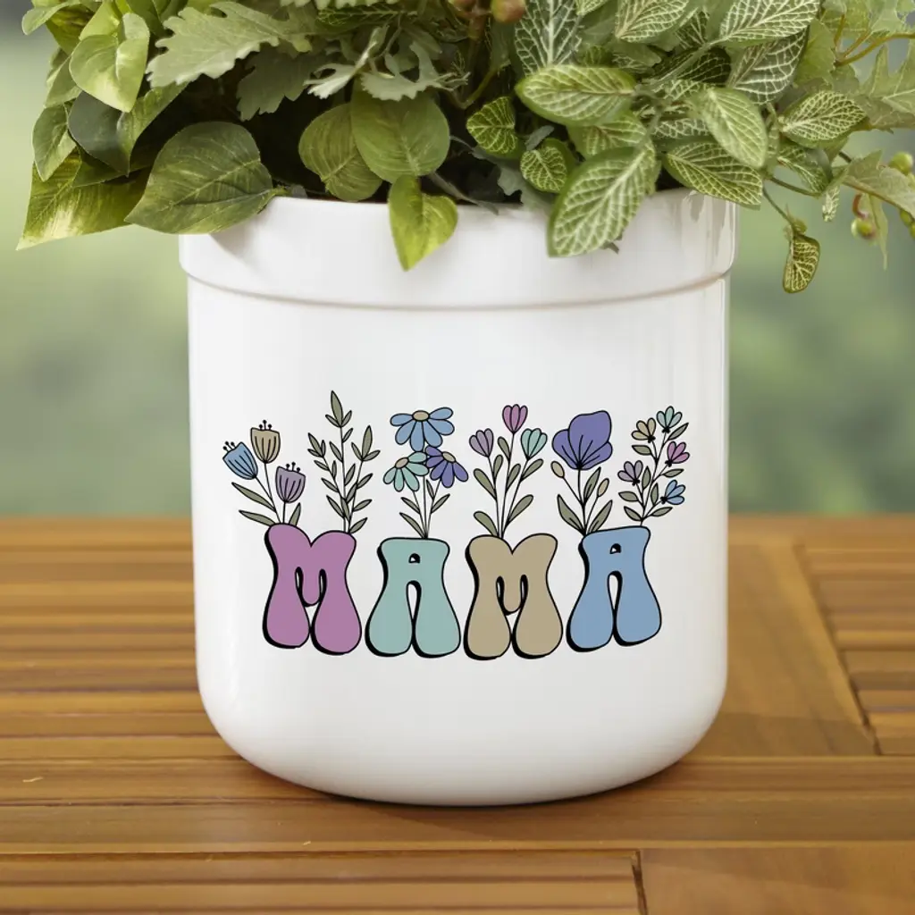 Celebrate the special bond with mom through this charming outdoor ceramic flower pot, featuring a playful and colorful “MAMA” design adorned with whimsical floral illustrations. Perfect for succulents, cacti, or small houseplants, this glossy white planter adds a sweet, heartfelt touch to any patio. Crafted from high-quality ceramic, it’s both durable and stylish—ideal for Mother’s Day, birthdays, or just because. The pastel-toned design and cheerful aesthetic make it a thoughtful and lasting gift that’ll bring a smile every day.
