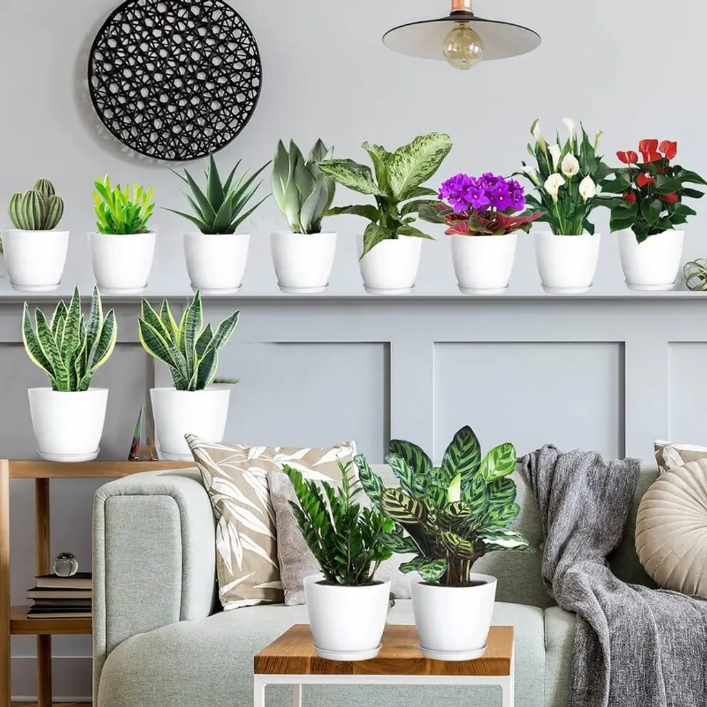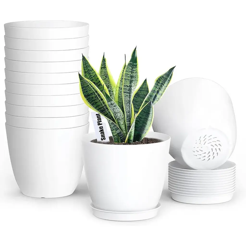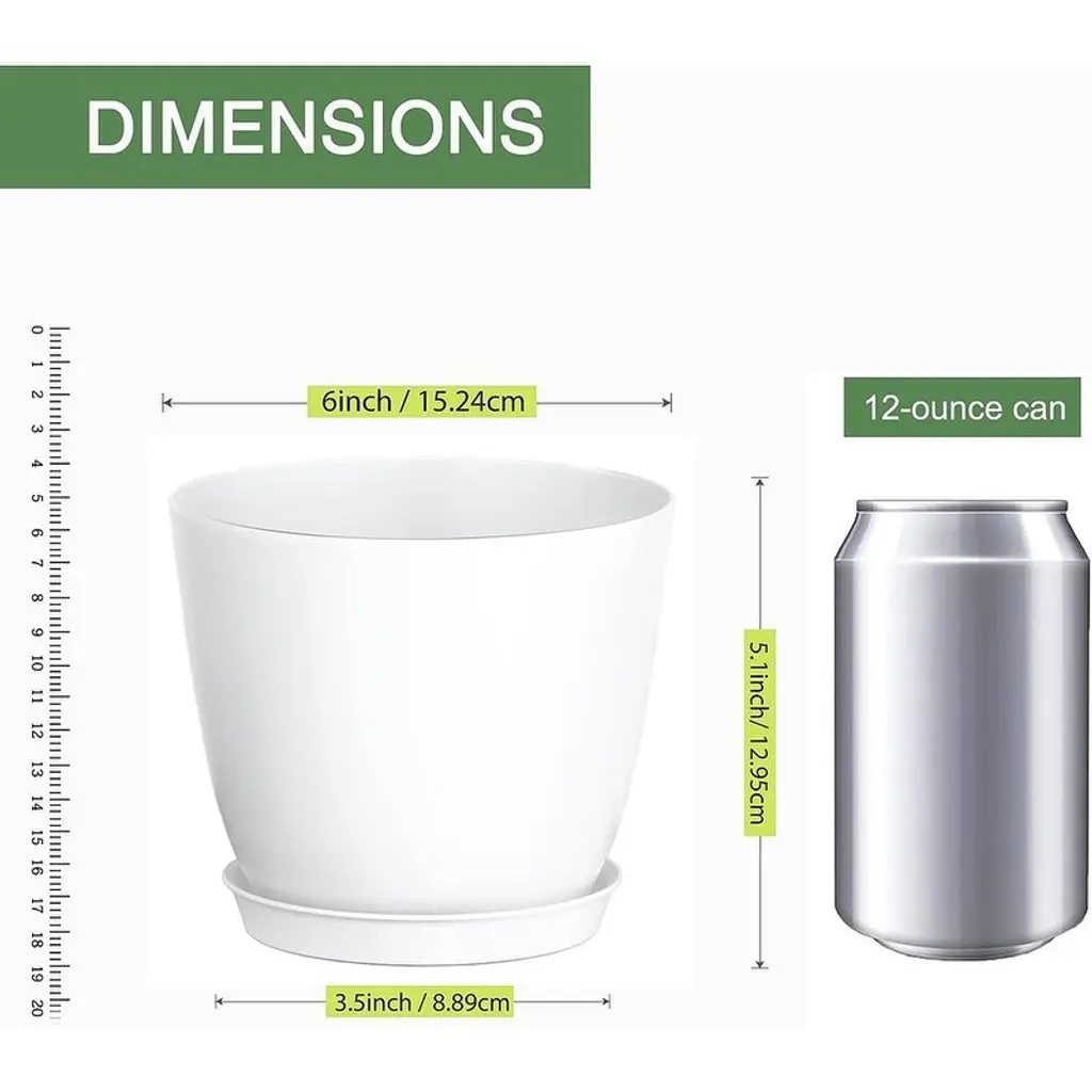 Multi Color Plant Pots with Drainage Holes with Saucers:Set of 12 pack modern plant pots, which includes Pink, Green, Orange and White, there are 3 color flower pots for each color. 36 leaf shaped drainage holes on the bottom of flower pots that keeps soil drained and ventilated to prevent soil-loss and helps protect against overwatering. To use a pot with a detachable saucer that can be empty the excess water easy and the soils can be keep dry out somewhat. Saucers with leak proof design is good for plant growth. Excellent for Repotting Indoor Plants:12 pack 6 inch plant pots with 12 pack plant labels and saucers are good for repotting plants and flowers which between 3''~5''. These pots are best to pour no more than 1/3 of the container's size in water. We suggested that Soil with 1 quart (1L) = 0.03 cu. ft. for 6 inch pot. Modern Matte Exterior Finish Easy to Clean:These plastic plant pots are made by PP materials. Modern matte exterior finish are very elegant and can be used for vinyl printing. These pots are easy to clean and get clean of dirty easily on the outside, it's not a stained looking mess. The color and shape of plant's foliage is highlighted by the minimalist round pot, that will pay more attention to the plants and flowers. It doesn't distract from what's inside.table for planting aloe Vera plants, air plants, flowers, vegetables, etc. Decorative Flower Planters: Modern and s[Decoration Your Indoor Garden] The round shape modern planters for indoor plants are perfect to decorate your shelf, window sill, desktop, kitchen, living room, bedroom, garden, office, etc. The plants containers gardening makes it possible to grow beautiful plants indoors, on a balcony, or in a tight corner of your garden.imple design perfect to decorate your home, offices, dorm, sunny window, desktop, shelf, bedroom, kitchen, garden and so on. Suitable for whether indoor or outdoor. Widely Used]:These 6 inch planters are perfect for growing most house plants and flowers, such as Aloe Vera, Snake Plants, Spider Plants, Pothos, Peace Lily, ZZ plants, Mint, Parlor Palm, Cactus, Orchid, Succulents, or Herbs, and other such small indoor plants.