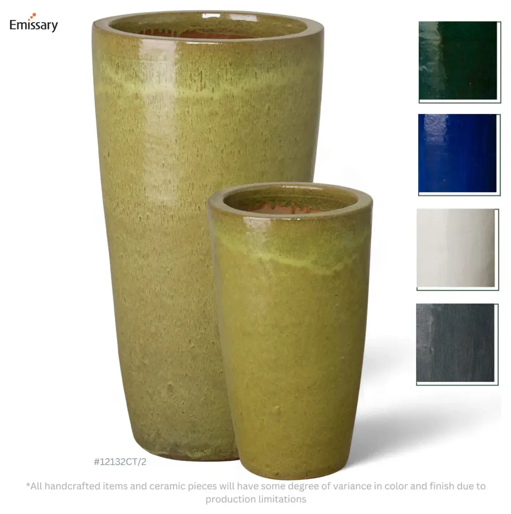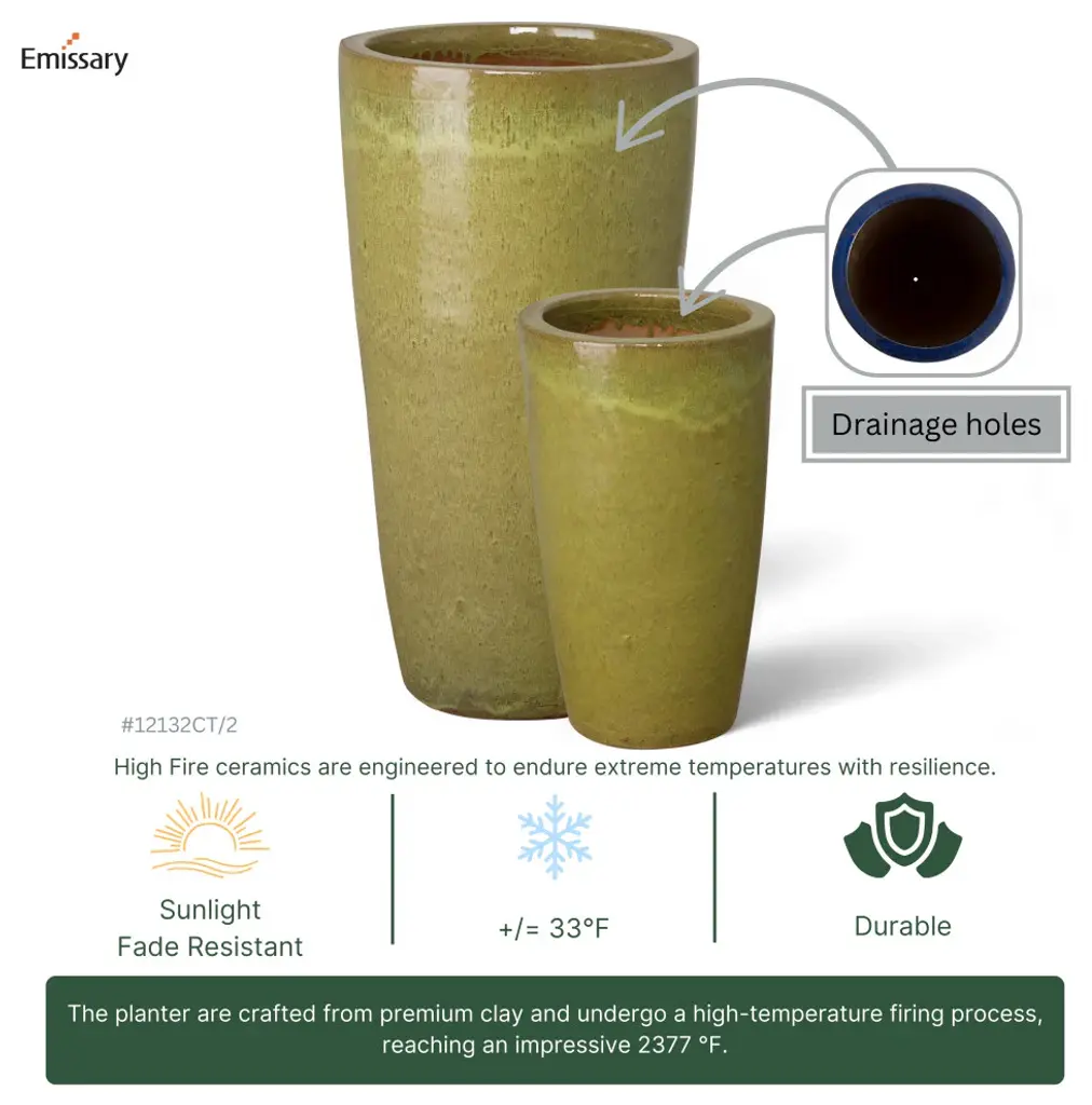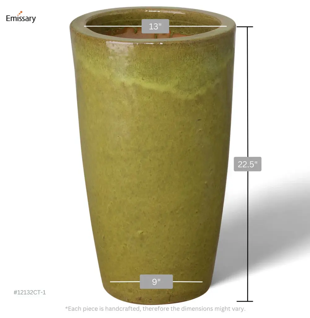 This Round Tall planter is crafted of ceramic with a Citron glaze. Suitable for outdoor and indoor use. Adds color and texture to your home or garden.