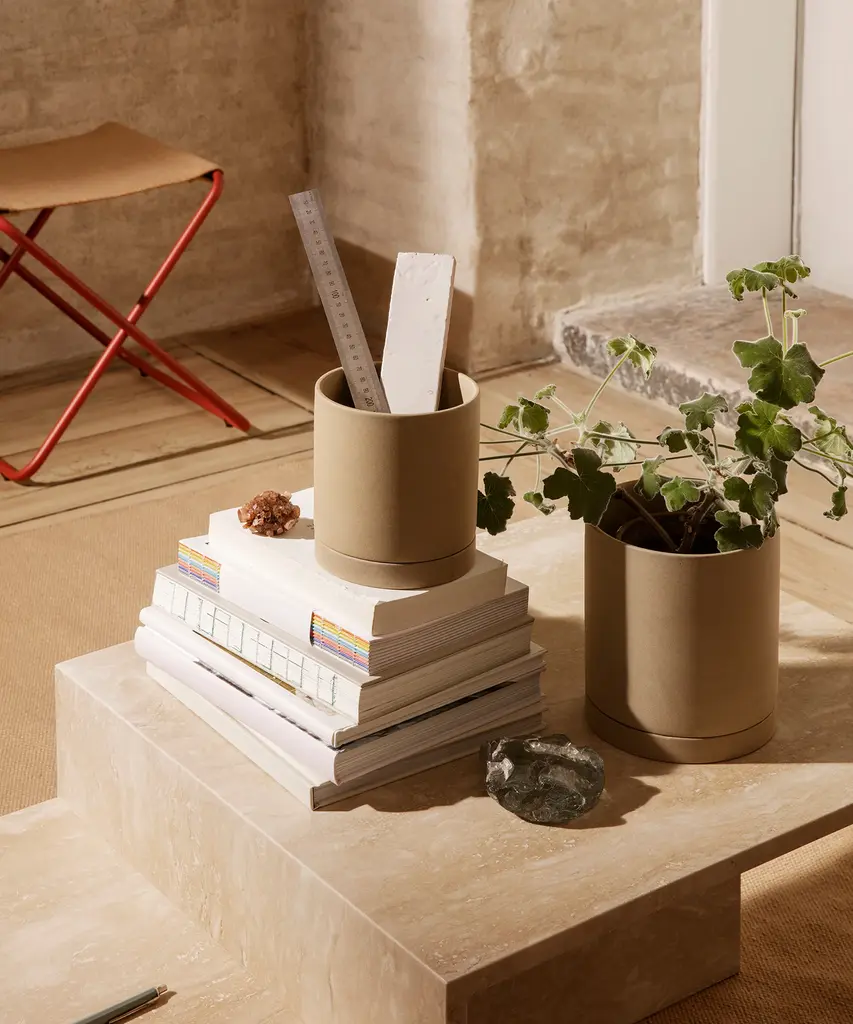 A planter series that rediscovers the magic of ancient manufacturing and materiality. The Sekki Pots are made of clay with a remarkable, coarse texture and rich, earthy color. The Sekki Pot comes with a matching saucer for optimal care for your plants. Available in two sizes.Designed and produced by the Copenhagen-based studio Ferm Living.
