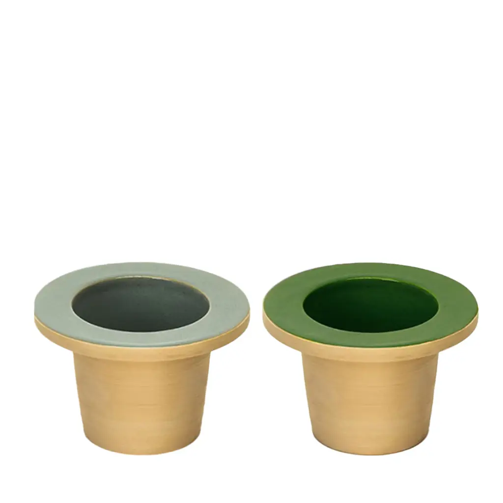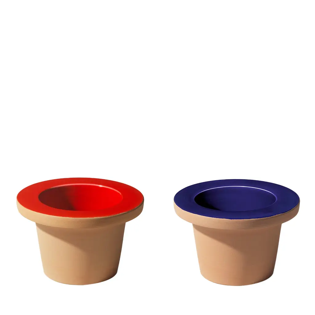 This stylish set of cachepots captures the effortless combination of the charm of terracotta offered in its natural matte finish and the intensity of a polished yellow and pink accenting the rim and internal surface. Marked by a clean design reminiscent of thimbles, the piece is entirely crafted by hand and supplied in an exclusive gift box.