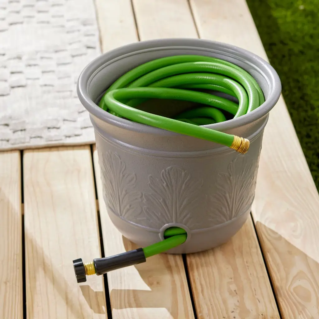 Never have your garden hoses simply piled around your home ever again when you coil them neatly within the Suncast 5-Gallon Garden Hose Pot (2-Pack). This decorative hose storage pot holds up to 300 feet of expandable hose, though planter capacity may vary depending on the type of hose you're looking to store. It is durable against the outdoor elements and easy to maintain. Hose planter features opening for hose connection to water supply and drain holes in base to release trapped water. Lightweight planter can be moved with little effort around the garden, patio, or backyard. Hose planter does not include hose or lid. Grab hold of this elegant hose planter to keep your water hoses organized and neatly concealed wherever you need them.